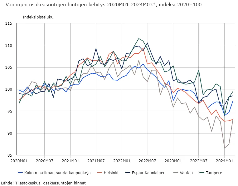 Viime aikoina asuntojen hinnat ovat jo kääntyneet loivaan nousuun monilla alueilla – kuten alla olevasta kuvaajasta käy ilmi –. Tämä johtuu useista tekijöistä, kuten kasvavasta kysynnästä, paikoin rajoitetusta tarjonnasta ja luottamuksesta siihen, että hinnat kyllä jossain vaiheessa palautuvat. Jos odotettu korkojen lasku edelleen kiihdyttää kysyntää, asuntojen hinnat tulevat nousemaan entisestään.