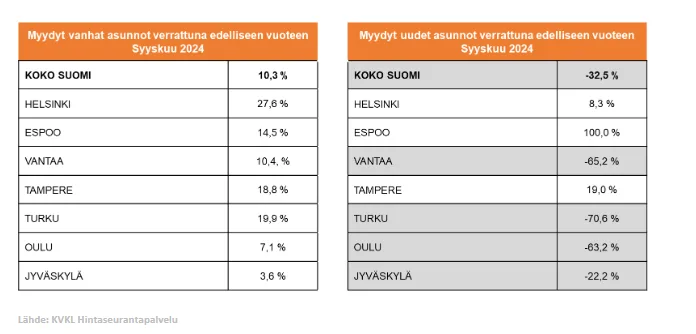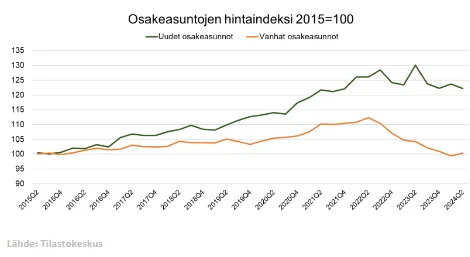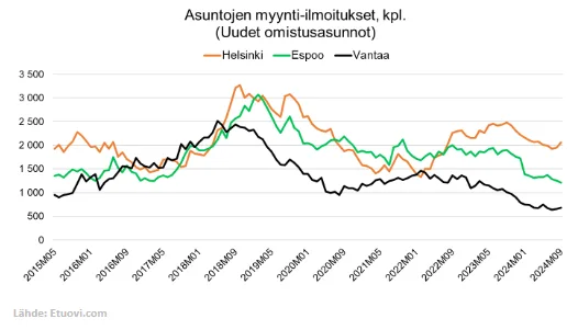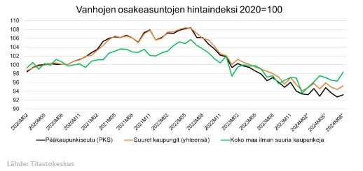Tilastokeskuksen ennakkotietojen mukaan vanhojen osakeasuntojen hinnat laskivat koko maassa 1,5 % edellisestä vuodesta elokuussa 2024. Hintojen lasku oli suurinta Helsingissä (-5,6 %) ja Vantaalla (-5,0 %), mitä osittain juuri korkea tarjonta selittää. Kokonaisuudessaan edelliseen kuukauteen verrattuna hinnat nousivat kuitenkin kokonaisuudessaan koko maassa 1,3 %.