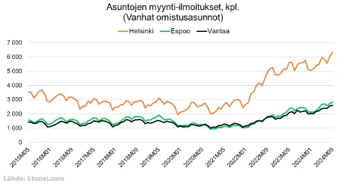 Vaikka kauppamäärät ovat nousseet, suurissa kaupungeissa vanhojen asuntojen hintojen kasvua rajoittaa jopa ennätyksellinen tarjonta. Tämä on ilmeistä erityisesti pääkaupunkiseudulla. Vuodesta 2022 vanhojen asuntojen myyntivarasto on kasvanut ja saavuttanut tilastojen valossa historiallisen korkean tason.