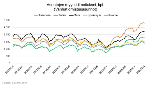 Käytettyjen asuntojen tarjontaa on runsaasti suurissa kaupungeissa pääkaupunkiseudun ulkopuolella, mutta syyskuussa myynti-ilmoitusten lukumäärät eivät enää nousseet uusille huipuille. Tilastoissa tarjonta alkoi kasvamaan merkittävästi myös pääkaupunkiseudun ulkopuolisissa suurissa kaupungeissa vuodesta 2022.