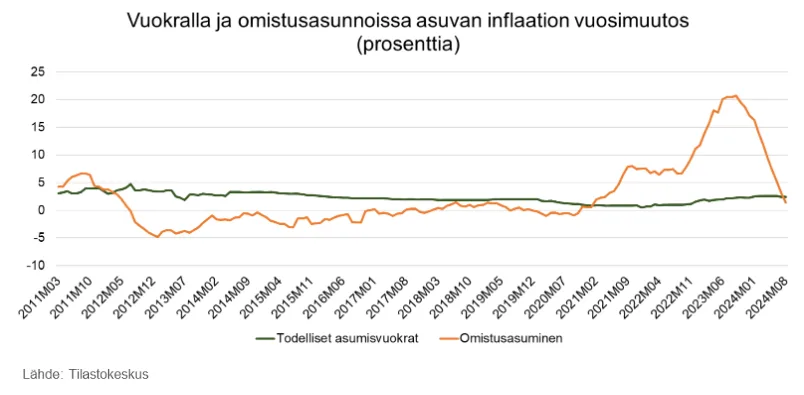 Nollakorkoaikana omistusasuminen oli pitkään huomattavan edullista suhteessa vuokralla asumiseen, mutta vuonna 2022 suhdeluvussa tapahtui käänne korkojen lähdettyä nousuun. Viimeisen kahden vuoden aikana nopea korkojen nousu ja samalla vuokrahintojen maltillinen kehitys käänsivät tilanteen vuokra-asumisen eduksi. Nyt yhtälö on odotetusti palannut tutulle kehityspolulle, mikä ilmenee Tilastokeskuksen 13.9.2024 julkaisemista omistus- ja vuokra-asujien inflaatioluvuista.