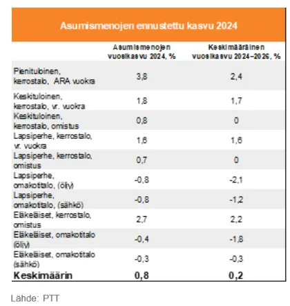 Kotitalouksien asumiskustannukset nousivat 2020–2023 Suomessa reilusti, keskimäärin 16 %. PTT:n Asumismenot 2024 -selvityksen mukaan asumismenojen kasvu laantuu tänä vuonna ja näköpiirissä on menojen tasaantuminen. Vuosina 2024–2026 keskimääräisten asumismenojen arvioidaan pysyvän likimain ennallaan. Vuokrakerrostalossa asuville asumismenoja koskevat uutiset ovat epäsuotuisimpia. Esimerkiksi vuokrakerrostaloissa asumismenot kasvavat tänä vuonna 1,8–3,8 prosenttia riippuen vuokralaisen asunnon rahoitusmuodosta.