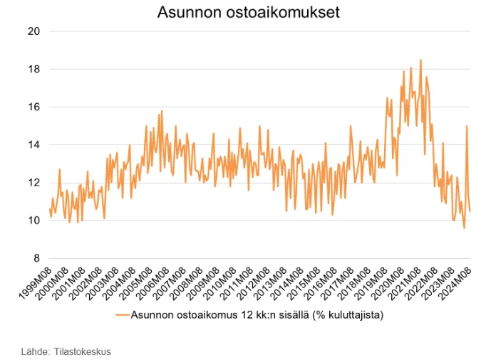 Tilastokeskuksen mukaan kesäkuussa asunnon ostoaikomukset nousivat EKP:n koronlaskun myötä, kun 15 prosenttia kuluttajista oli kiinnostuneita asunnon ostosta. Elokuussa kiinnostus laski 10,5 prosenttiin.