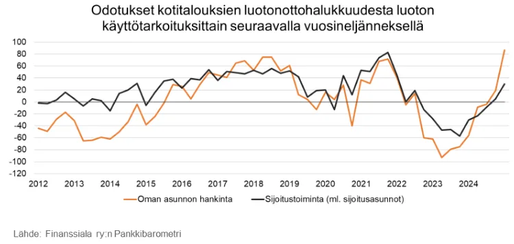Samaan aikaan pankinjohtajien odotukset kotitalouksien lainanottohalukkuudesta loppuvuodelle 2024 ovat merkittävästi nousseet edellisvuodesta, erityisesti asuntolainojen osalta. Oman asunnon hankintaan otettavien lainojen saldoluku on noussut poikkeuksellisen korkealle, 87 pisteeseen Pankkibarometrissä.