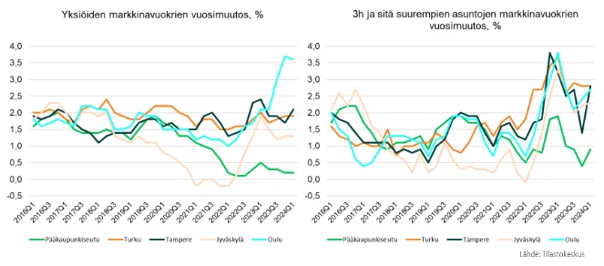 Pääkaupunkiseudulla yksiöiden ja kaksioiden vapaarahoitteiset vuokrat nousivat 24Q1:llä 0,2 % ja 0,1 % edeltävään vuoteen verrattuna, mutta vastaavasti kolmioiden ja sitä suurempien vuokra-asuntojen vuokrat nousivat 0,9 % Tilastokeskuksen mukaan. Myös Tampereella vapaarahoitteisten yksiöiden vuokrien vuosimuutos (2,1 %) oli kolmiota ja sitä suurempia asuntoja pienempi (2,8 %).