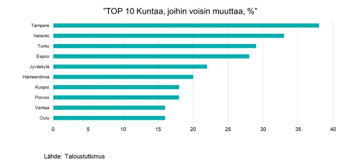 Elinvoimaisella keskustalla on suuri vaikutus myös muuttohalukkuuteen. Taloustutkimuksen loppuvuonna 2023 toteuttaman Muuttohalukkuus Suomessa -tutkimuksen mukaan peräti 38 prosenttia 15–79-vuotiaista suomalaisista voisi ajatella asuvansa Tampereella. Toiseksi suosituin kaupunki on Helsinki, jossa voisi kuvitella asuvansa 33 prosenttia suomalaisista, ja kolmanneksi suosituin Turku, jonka nimesi 29 prosenttia vastaajista. Kärkikolmikko Muuttohalukkuus Suomessa -tutkimuksessa oli sama kuin valtakunnallisessa elinvoimatutkimuksessa.