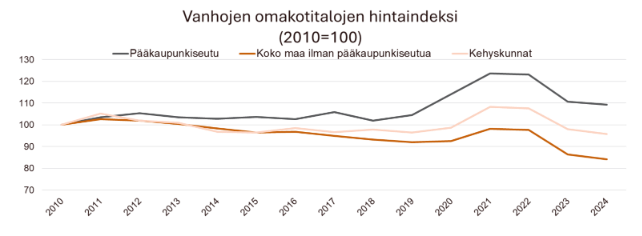 Tällä vuosituhannella omakotitalojen hintakehitys on kuitenkin vaihdellut voimakkaasti alueittain. Omakotitalomarkkinoiden alueellinen polarisaatio on puhuttanut jo pitkään, eikä syyttä. Vuosien 2010 ja 2024 välillä vanhojen omakotitalojen hinnat ovat nousseet ainoastaan yli 100 000 asukkaan kunnissa, mutta vain 1,5 %, eli hinnat ovat käytännössä vuoden 2010 tasolla. Pääkaupunkiseudulla hinnat ovat sen sijaan nousseet vastaavana aikana 9,3 %.