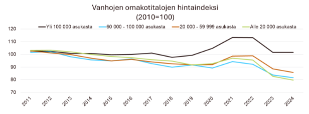 Muuttotappiopaikkakunnilla omakotitalojen hintojen nousu on jatkossakin haastavaa, kun kiinteistöjen kysyntä vähenee vuosi vuodelta. Tilannetta kuvaa hyvin se, että alle 20 000 asukkaan kunnissa vanhojen omakotitalojen hinnat ovat laskeneet peräti 20,3 % vuosien 2010 ja 2024 välillä.
