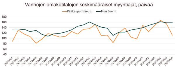 Omakotitalokauppa on kasvanut trendinomaisesti kuluneen vuoden aikana, ja tammi–huhtikuussa vanhojen omakotitalojen kauppamäärät ovat jääneet vain hiukan viiden vuoden keskimääräisestä tasosta (-0,2 %). Sen sijaan kerrostaloasunnoilla vastaava luku on enemmän pakkasella (-10,4 %). Omakotitalojen keskimääräiset myyntiajat ovat kuitenkin edelleen pitkiä, mutta ne ovat lyhentyneet huipuiltaan, erityisesti pääkaupunkiseudulla. KVKL:n mukaan huhtikuussa suurin muutos keskimääräisissä myyntiajoissa tapahtui pääkaupunkiseudulla, missä omakotitalojen myyntiaika lyheni lähes 1,5 kuukaudella verrattuna maaliskuuhun.