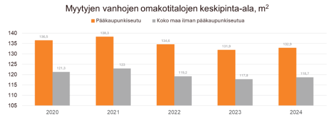 Piristyneestä markkinasta kertoo myös se, että myytyjen vanhojen omakotitalojen keskipinta-alan laskutrendi kääntyi viime vuonna. Keskipinta-ala oli erityisen korkea vuonna 2021, jolloin korona-aikojen paineessa haluttiin enemmän tilaa. Sittemmin haastavat asuntokauppavuodet ja taloudellinen epävarmuus ovat vaikuttaneet suurempien omakotitalojen kysyntään. Nyt kuitenkin suurempia omakotitaloja on myyty paremmin, mikä viittaa siihen, että markkinoilla on enemmän luottamusta tulevaisuuteen kuin aiemmin.