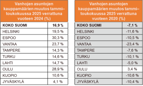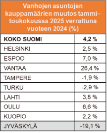 Alkuvuoden 2025 aikana asuntomarkkinoilla on nähty rohkaisevia merkkejä elpymisestä. Tammi–toukokuussa vanhojen asuntojen kauppamäärät kasvoivat suurimmissa kaupungeissa kaksinumeroisin prosenttiluvuin verrattuna vuoden takaiseen, lukuun ottamatta Jyväskylää. Erityisen vahvaa kehitys on ollut Espoossa (+30,3 %), Oulussa (+28,9 %) ja Vantaalla (+23,7 %).