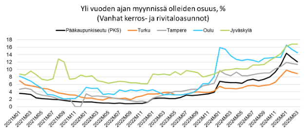 Jyväskylän markkinahaasteet näkyvät tosin myös tässä tilastossa, sillä siellä pitkään myynnissä olleiden asuntojen osuus ei ole vähentynyt samaan tapaan kuin muilla suurilla paikkakunnilla. Yhteenvetona voidaan todeta, että vaikka vanhojen asuntojen kauppa on käynyt kuluneena vuonna selvästi vilkkaammin kuin viime vuonna, alueelliset erot korostuvat.