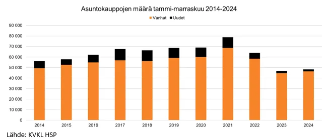 Viimeiset vuodet ovat olleet Suomen asuntomarkkinoille haastavia, vaikka asiantuntijat ovat ennustaneet jo pitkään elpymistä. Kokonaisuudessaan tammi-marraskuussa vanhojen asuntojen kauppoja on tehty 4,1 % enemmän kuin vuonna 2023. Kauppamäärät ovat kuitenkin selvästi alle pitkän aikavälin keskiarvon. Viiden vuoden takaisesta tasosta tammi-marraskuun kaupat jäävät 20,1 %.