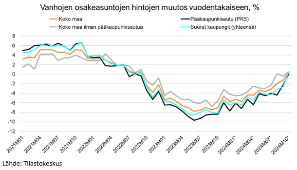 Lokakuussa 2023 käytettyjen asuntojen hintojen vuosimuutos kääntyi positiiviseksi ensimmäistä kertaa syksyn 2022 jälkeen, kertoo Tilastokeskus. Ensi vuonna odotetaan asuntokaupan piristymisen vauhdittavan hintojen nousua, mikä johtuu muun muassa matalammasta korkotasosta ja käytettyjen asuntojen tarjonnan vähenemisestä.