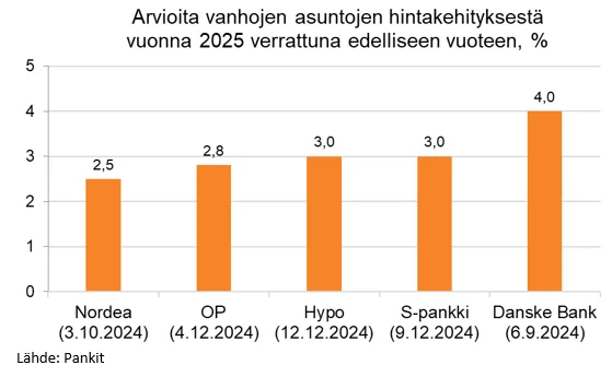 Suomen suurimmat asuntolainoittajat ennustavat vuodelle 2025 keskimäärin noin 3 %:n vuosittaista hintojen nousua. Markkinoiden yleinen elpyminen etenee kuitenkin maltillisesti, eikä kesän 2022 hintahuipuille odoteta paluuta vielä vuosiin.