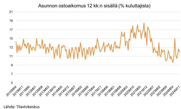 Marraskuussa 2024 asunnon ostamista ilmoitti harkitsevansa 12 % kuluttajista Tilastokeskuksen mukaan. Vuoden 2021 syksyn jälkeen asunnon ostoaikeet ovat pysyneet matalina.