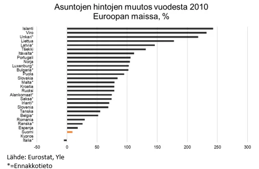 Suomessa asuntojen hinnat ovat nousseet vuoden 2010 jälkeen vain alle kymmenyksen, mikä poikkeaa monista Euroopan maista, joissa hinnat ovat nousseet huomattavasti enemmän. Erityisesti syrjäseuduilla hinnat alkoivat laskea jo ennen korkojen nousua. Tämä eriytyminen selittää osaltaan heikkoa hintakehitystä koko maan tasolla. Ensiasunnon ostajille tämä kehitys on positiivinen, sillä hinnat eivät ole nousseet liian korkeiksi.