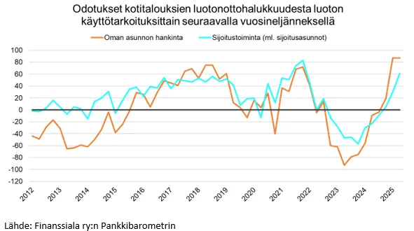 Alkuvuonna 2025 kotitalouksien lainanottohalukkuuden odotetaan olevan korkealla tasolla, ilmenee Finanssiala ry:n Pankkibarometristä. Barometrin mukaan asuntolainakysyntä on pysynyt korkealla tasolla, ja erityisesti alkuvuodelle 2025 odotetaan kasvua.