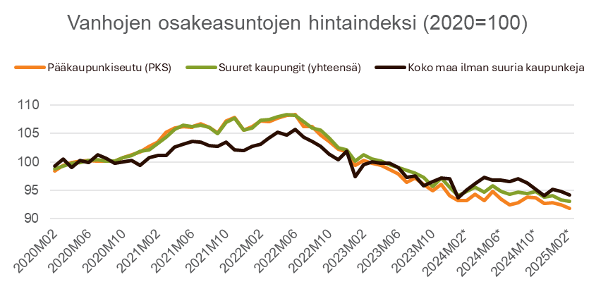 *Luvut perustuvat KVKL:n ylläpitämään Hintaseurantapalveluun, Tilastokeskuksen ja Suomen Pankin julkaisemiin materiaaleihin ja aineistoihin. Maaliskuun kauppaluvut haettu 11.4.2025.