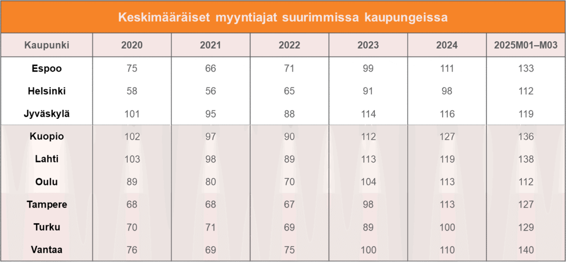 Runsas tarjonta hillitsee hintojen nousupaineita sekä ylläpitää pitkiä myyntiaikoja. Myyntiajat ovat venyneet yli 100 päivän keskiarvon koko Suomen tasolla, ja jopa suurimmissa kaupungeissa ne ylittävät reilusti sadan päivän rajan KVKL:n mukaan. Keväisin kysyntä kuitenkin piristyy ja myyntiajat tyypillisesti lyhenevät. Tämän valossa juuri nyt myyntiin laitettu asunto voi hyvin vaihtaa omistajaa selvästi nopeammin kuin alkuvuonna. Vuoden lyhyimmät myyntiajat ajoittuvat tilastojen valossa juuri loppukevääseen ja kesään.