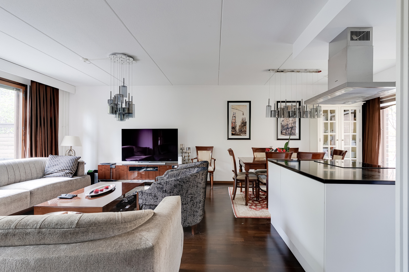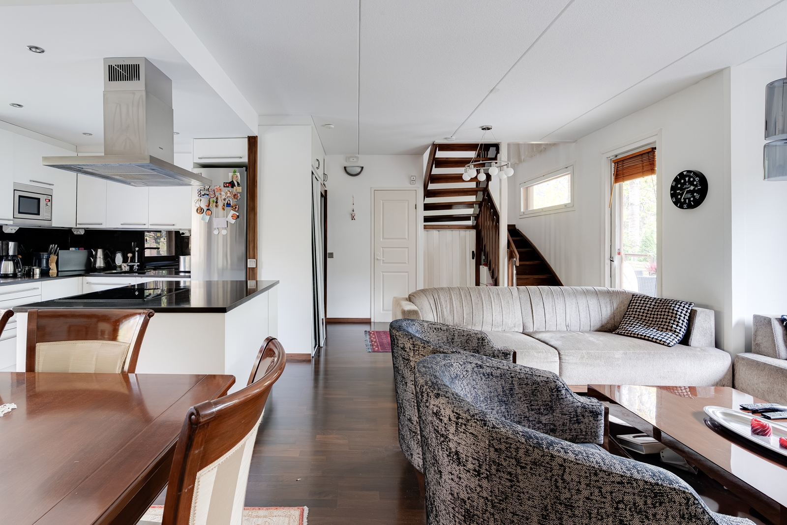 Olohuone ja keittiö muodostavat avaran kokonaisuuden, jossa saareke erottaa keittiön tyylikkäästi. Keittiö on varustettu laadukkailla kodinkoneilla, kuten induktioliesi ja erillisuuni, ja tilaa täydentää kaunis kvartsikomposiittitaso. Kolme makuuhuonetta tarjoavat rauhalliset tilat lepoon ja rentoutumiseen.