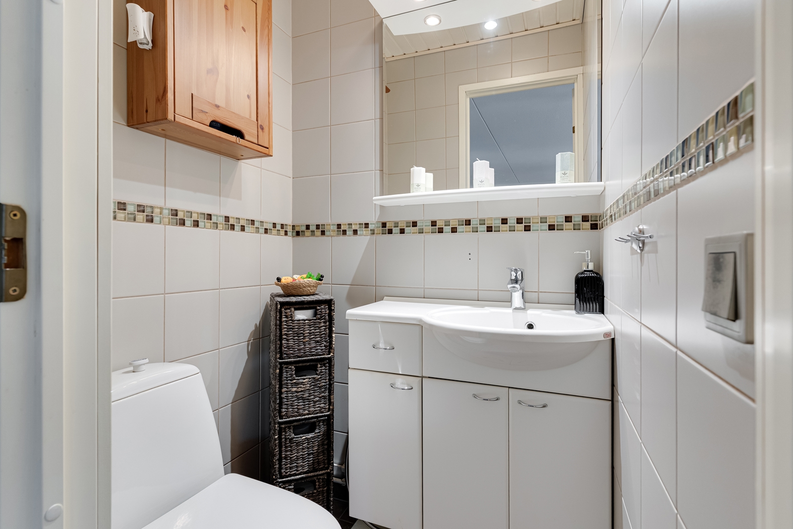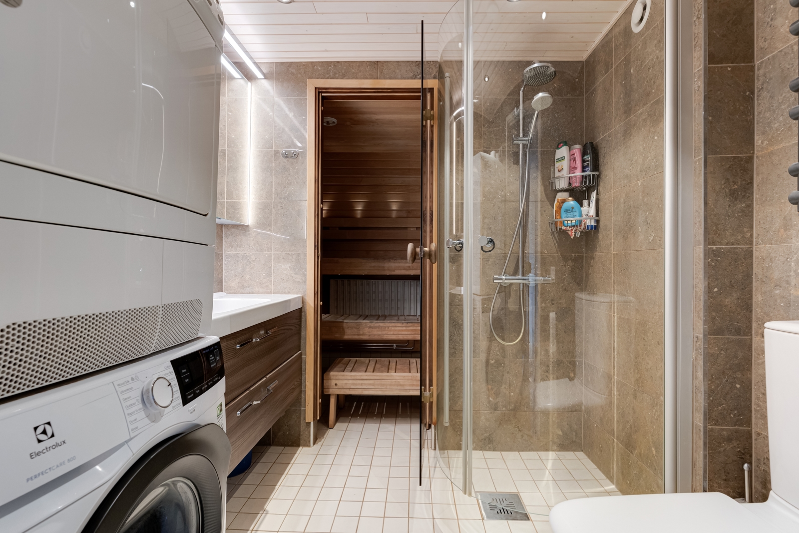 | Kylpyhuoneen kuvaus | WC-istuin, suihku, lattialämmitys, pesukoneliitäntä, peilikaappi, pesuallas, allaskaappi ja suihkuseinä, seinät (kaakeli), lattiat (laatta) |
