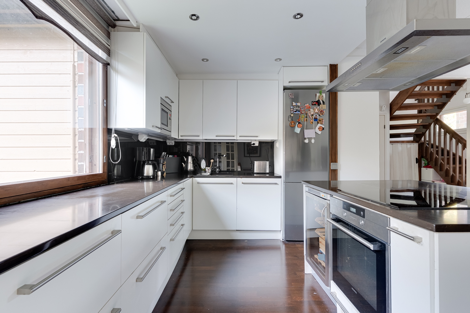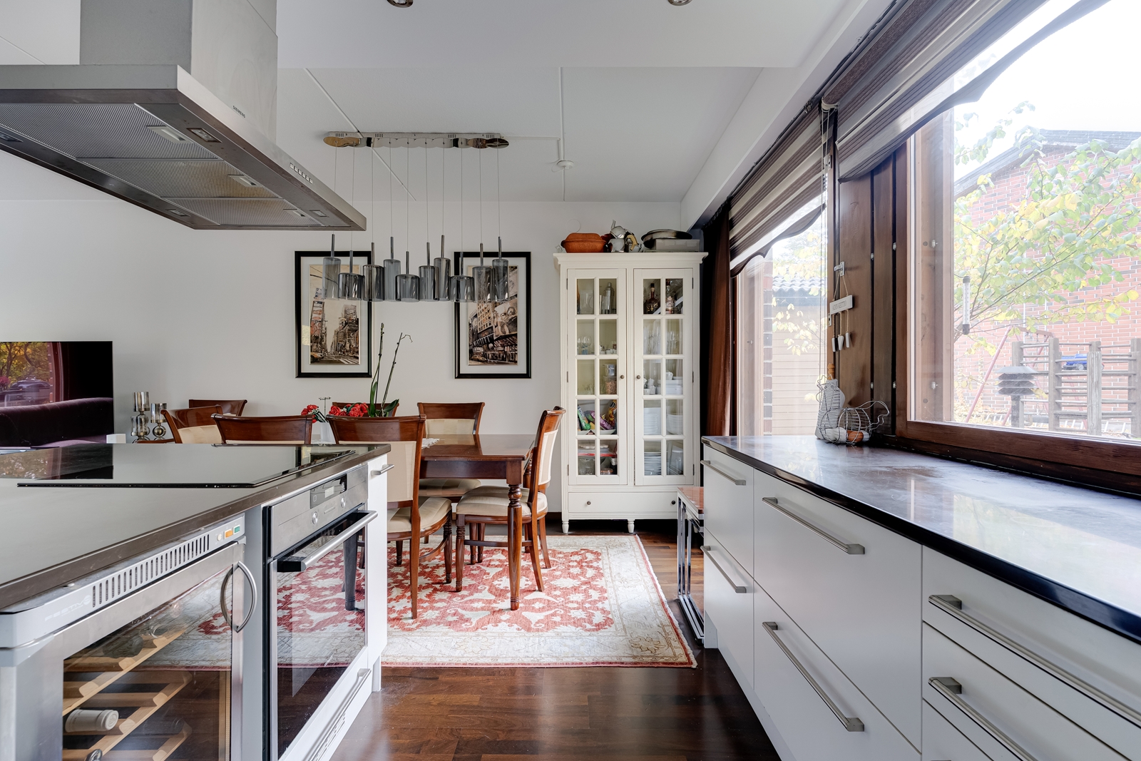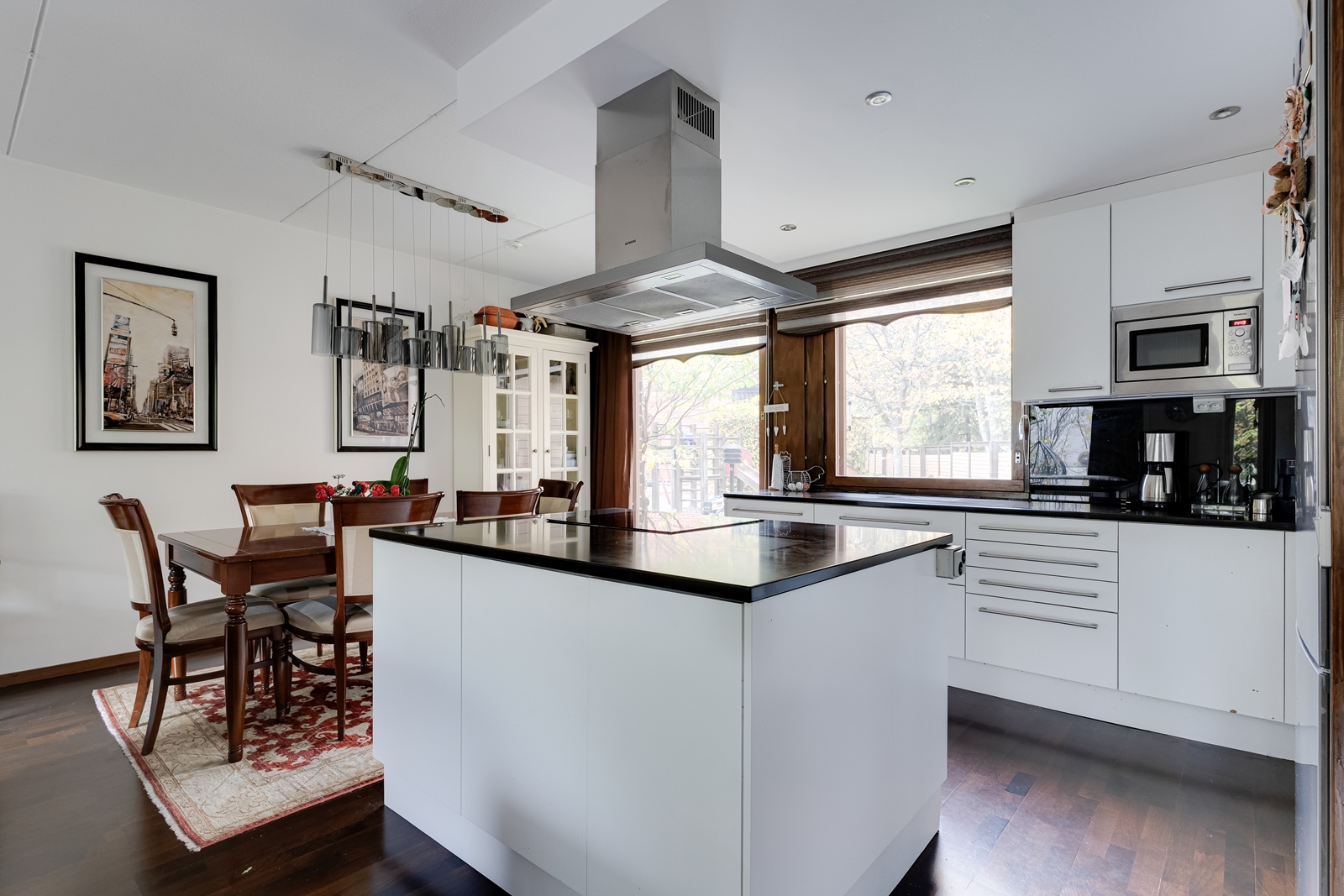 | Keittiön kuvaus | Liesi (Induktioliesi), työtasot (kvartsikomposiitti), seinät (maali ja välitila lasia), lattiat (parketti), jääkaappipakastin, erillisuuni, mikroaaltouuni, astianpesukone, keittiösaareke ja liesi |