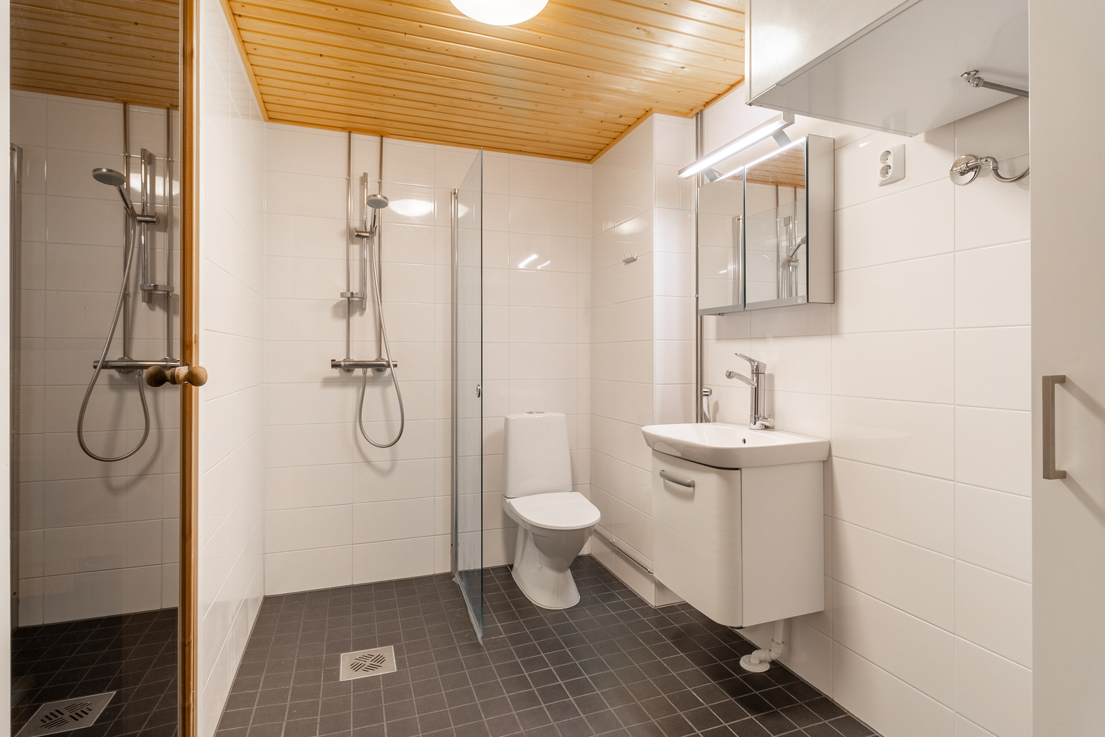 | Kylpyhuoneen kuvaus | WC-istuin, lattialämmitys, peilikaappi, suihkuseinä, pesukoneliitäntä ja suihku, seinät (kaakeli), lattiat (laatta) |