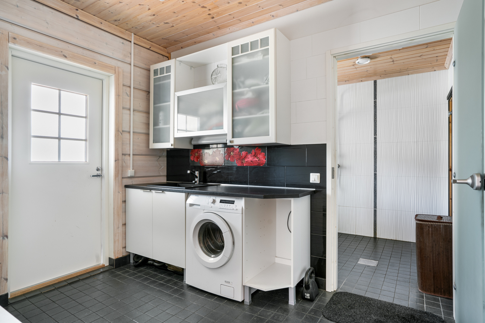 | Kodinhoitohuoneen kuvaus | Pesukoneliitäntä, pesuallas, lattiakaivo, pyykkikaapit, pöytätaso, lattialämmitys ja pesukone, lattiat (laatta), seinät (kaakeli, maali ja puu), Lisäksi sähköllä toimiva pyykinkuivausteline seinässä. |