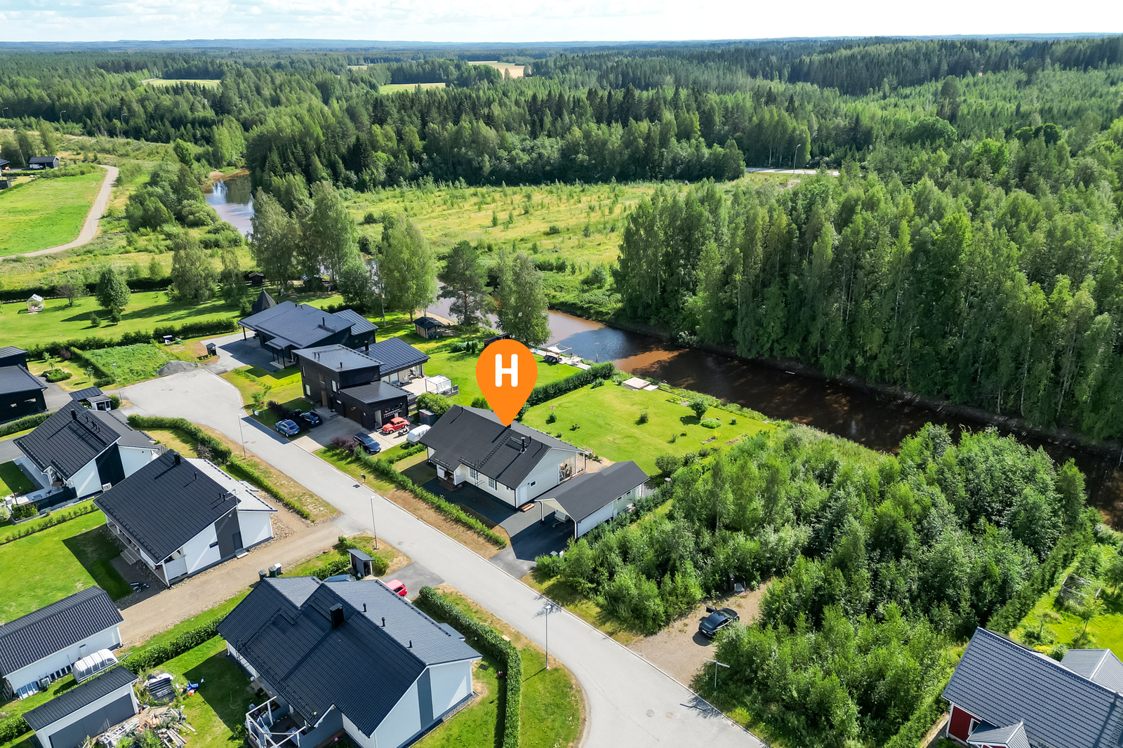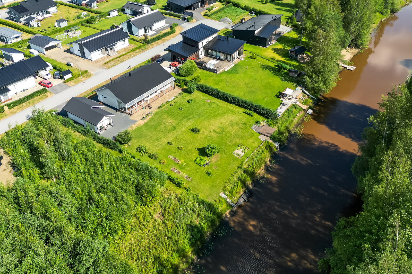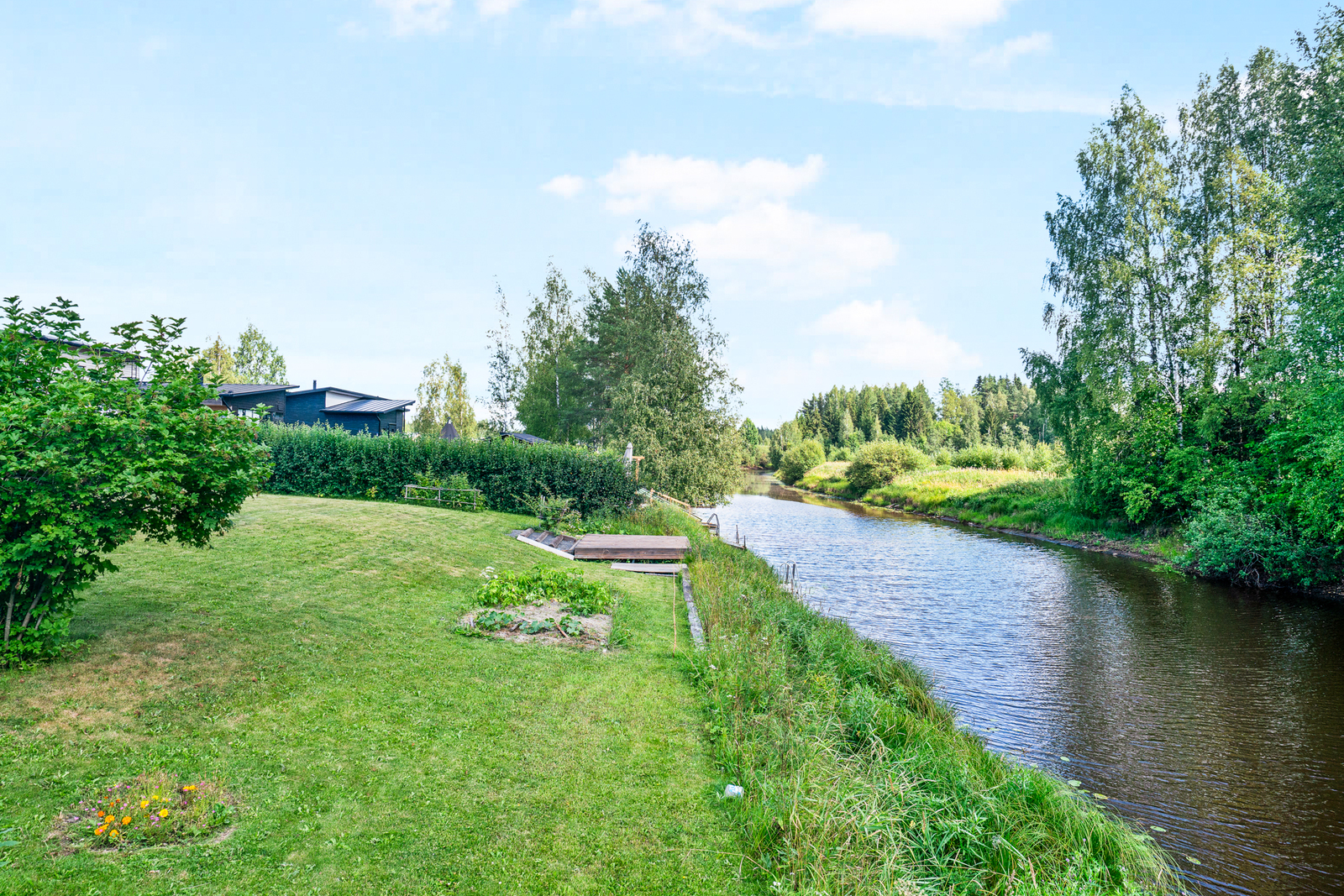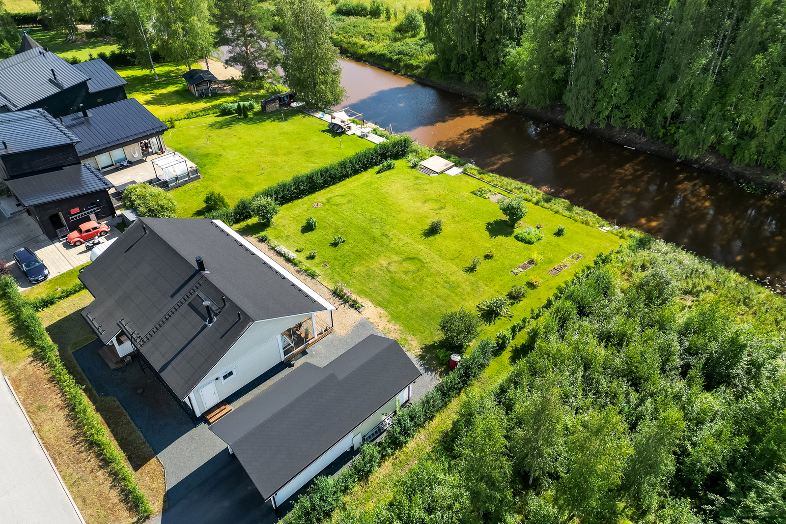 Tämä koti on rakennettu laadukkaasti ja se näkyy mm. korkeassa huonekorkeudessa, vinyylilattioissa, Parmakeittiön kaapistoissa sekä ajattomissa ja arvokkaissa kivitasoissa. Keittiö on tämän kodin sydän ja se yhdistyy saumattomasti ruokailutilaan ja olohuoneeseen mahdollistaen yhden suuren ja valoisan tilan. Keittiön suuri saareke takaa reilusti tasotilaa sekä helpon seurustelun muissa tiloissa olevien vieraiden kanssa. Edellä mainituista tiloista näkymä vehreälle takapihalle, joelle ja metsään. Tontin oikealla puolella tieltä katsottuna on lähivirkistysalue kaavan mukaan, joten siihen ei ole suunnitteilla asuinrakennuksen rakentamista.