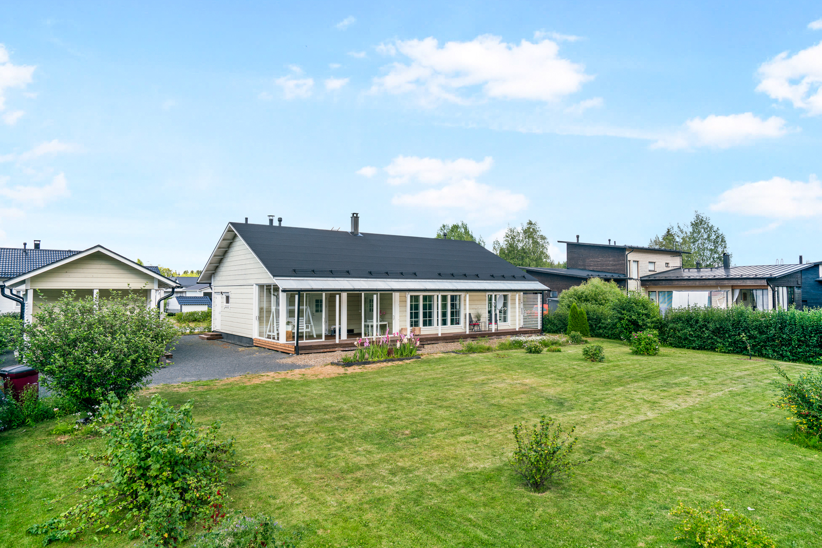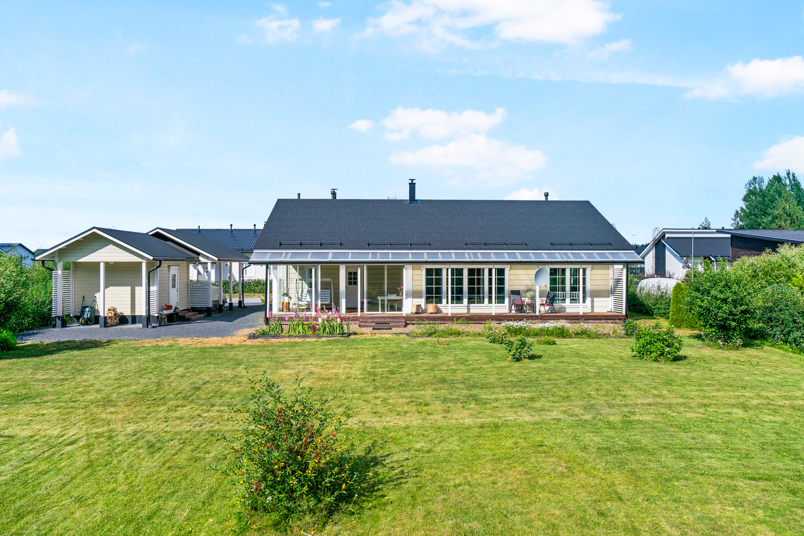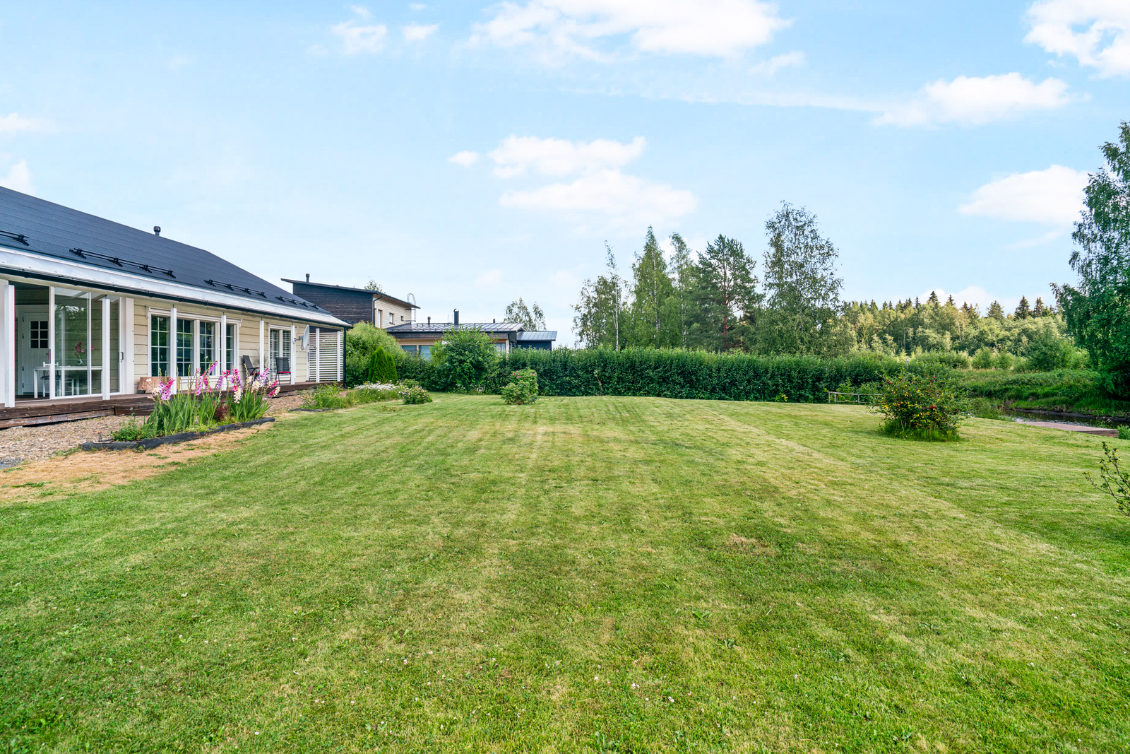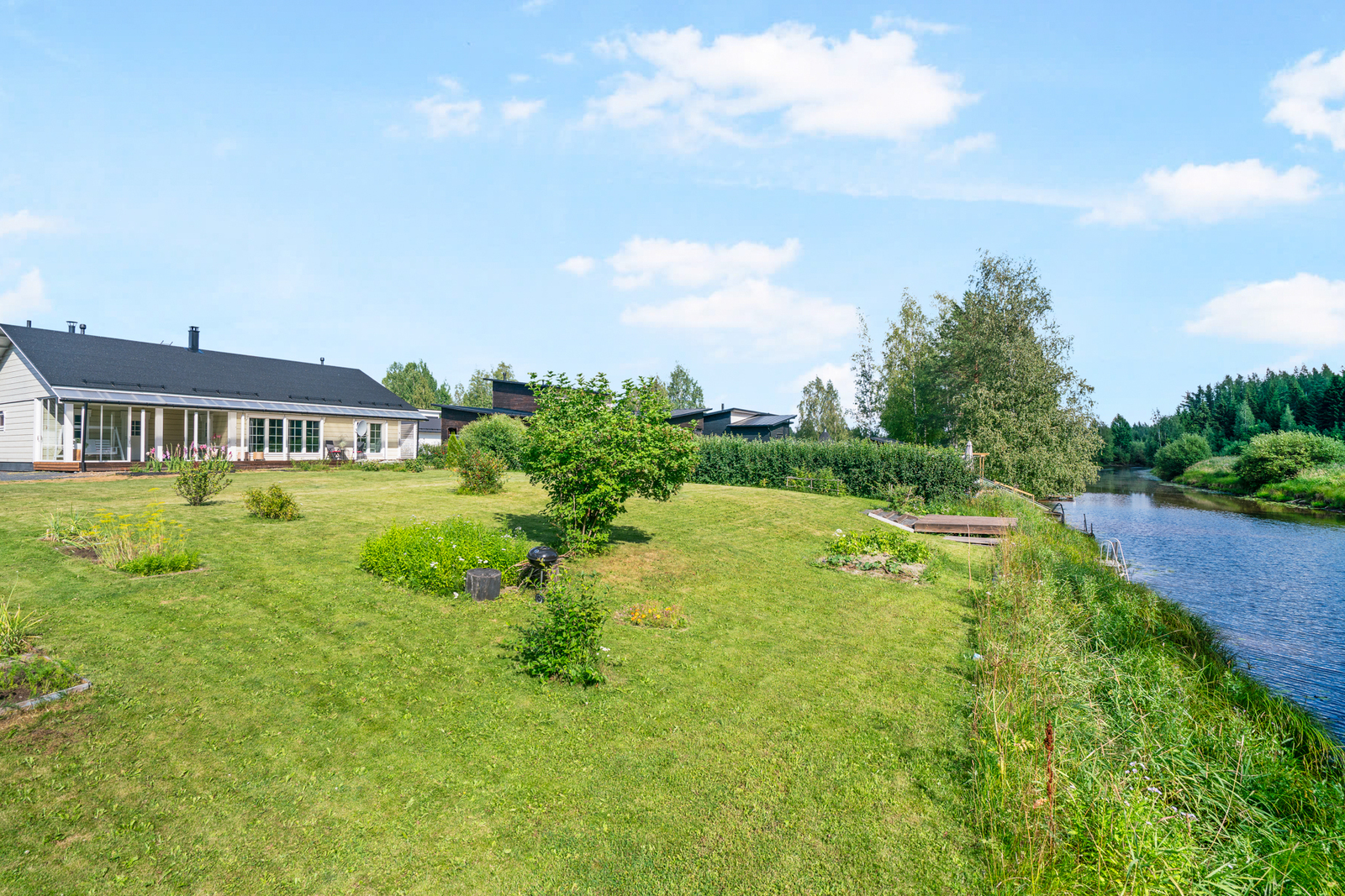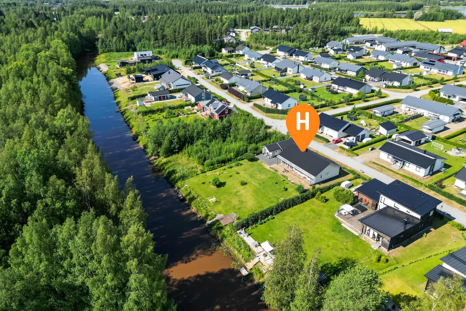 Tämä koti on rakennettu laadukkaasti ja se näkyy mm. korkeassa huonekorkeudessa, vinyylilattioissa, Parmakeittiön kaapistoissa sekä ajattomissa ja arvokkaissa kivitasoissa. Keittiö on tämän kodin sydän ja se yhdistyy saumattomasti ruokailutilaan ja olohuoneeseen mahdollistaen yhden suuren ja valoisan tilan. Keittiön suuri saareke takaa reilusti tasotilaa sekä helpon seurustelun muissa tiloissa olevien vieraiden kanssa. Edellä mainituista tiloista näkymä vehreälle takapihalle, joelle ja metsään. Tontin oikealla puolella tieltä katsottuna on lähivirkistysalue kaavan mukaan, joten siihen ei ole suunnitteilla asuinrakennuksen rakentamista.