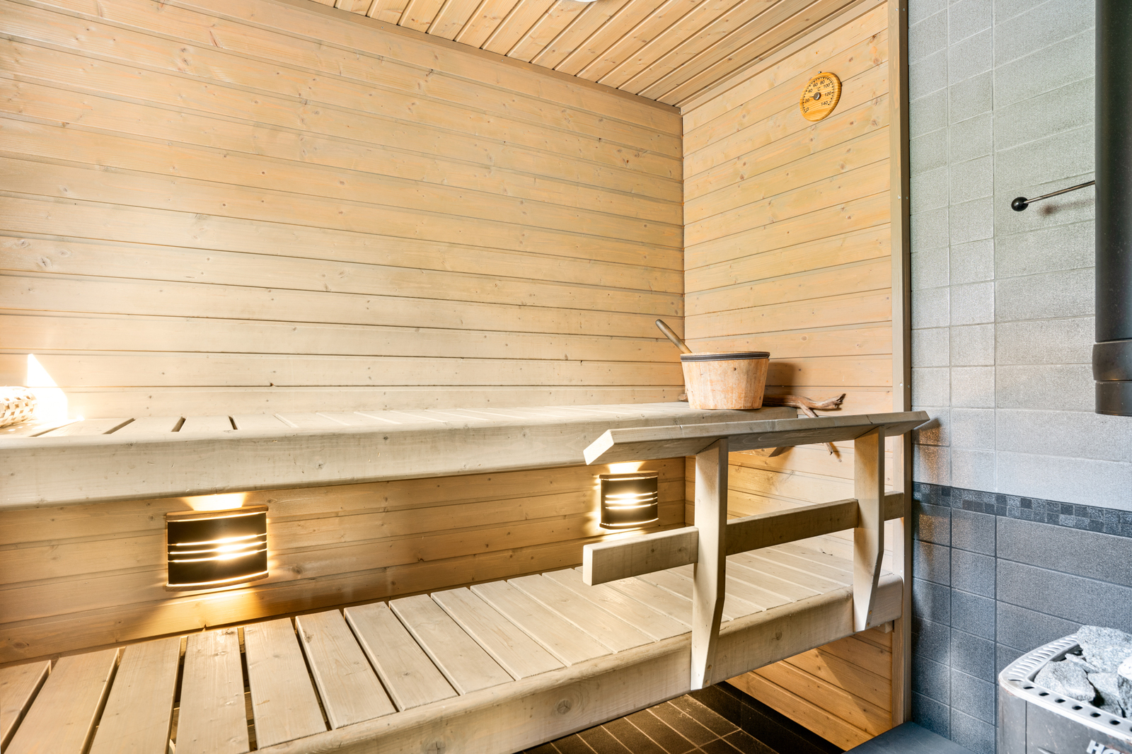 | Saunan kuvaus | Seinät (kaakeli ja puu), lattiat (laatta), Puukiuas |