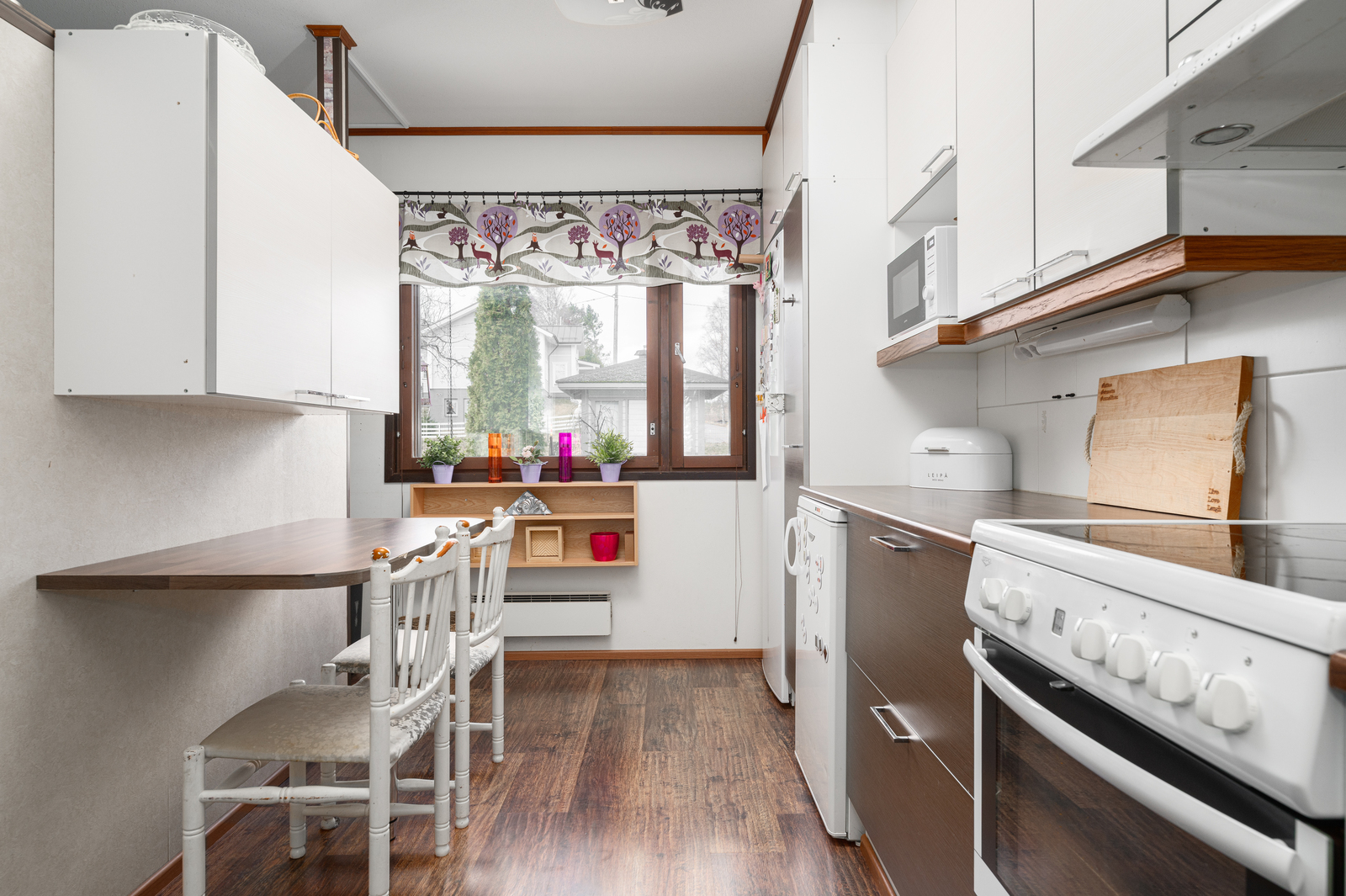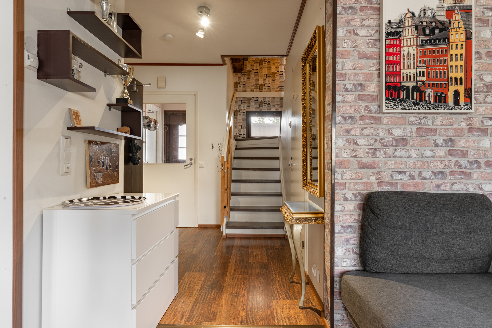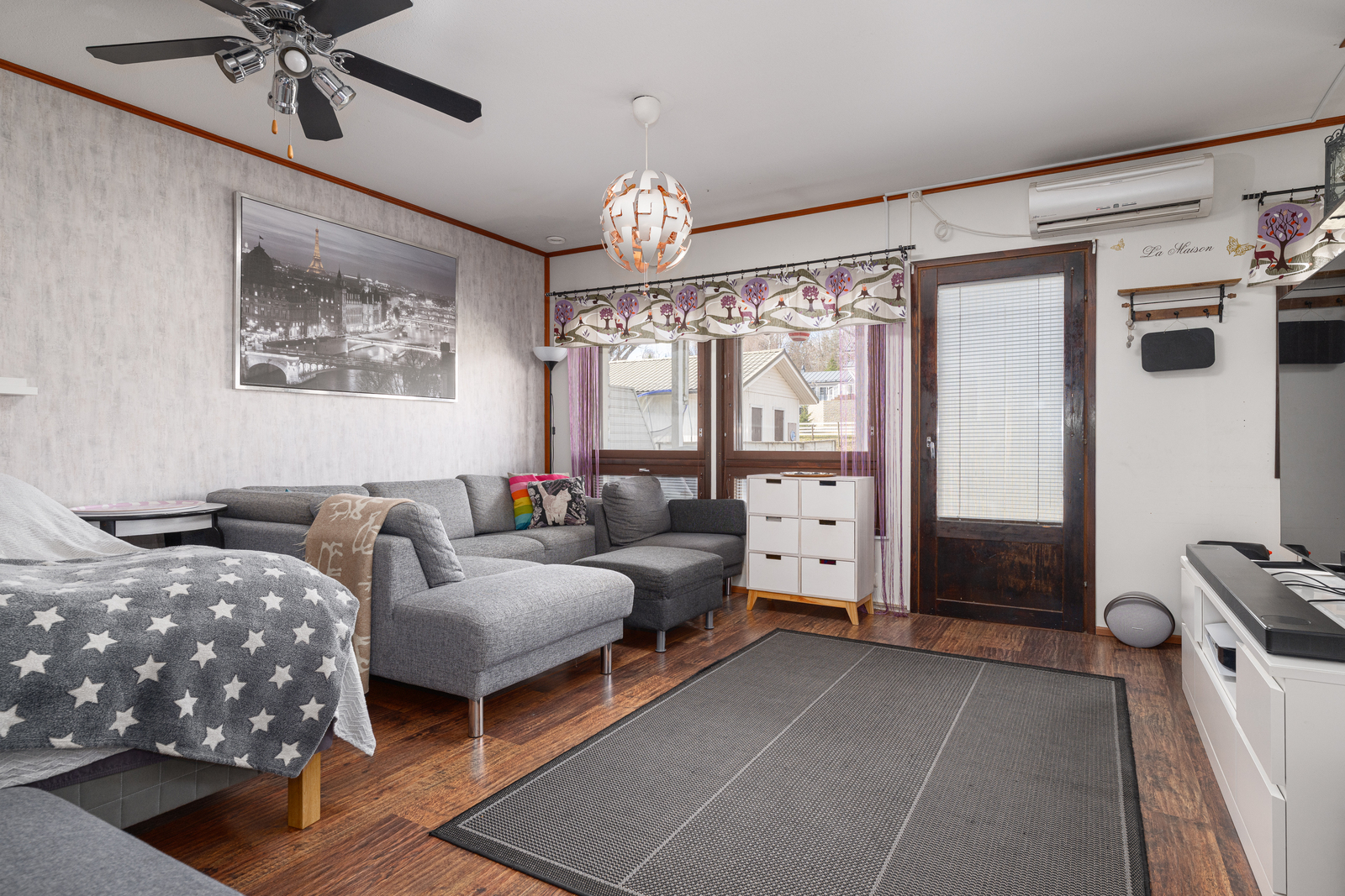 | Olohuoneen kuvaus | Seinät (maali ja tapetti), lattiat (laminaatti) |