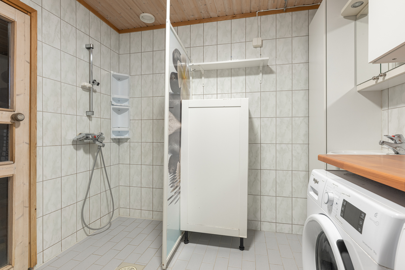 | Kylpyhuoneen kuvaus | Lattialämmitys, pesukoneliitäntä, suihkuseinä ja kiinteät valaisimet, seinät (kaakeli), lattiat (laatta), Kylpyhuoneen yhteydessä kodinhoitohuone. |