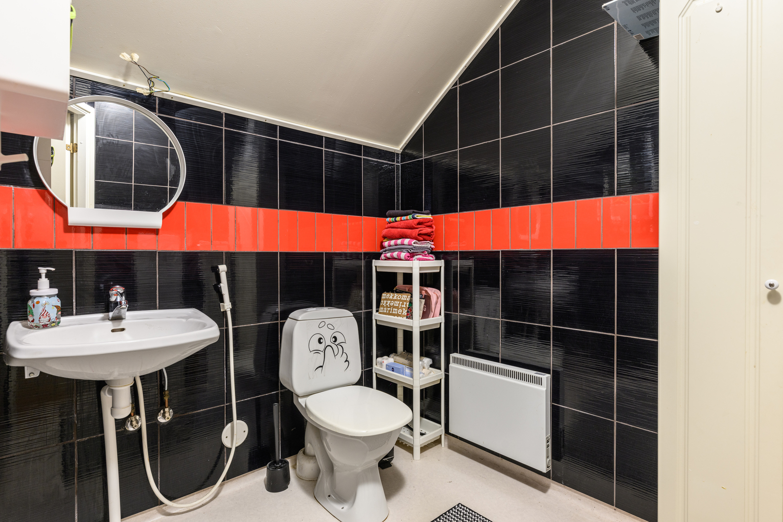 | WC-tilojen kuvaus | Lukumäärä: 2, seinät (Maali, tapetti ja kaakeli), lattiat (Muovimatto), Wc tiloissa on muovimatto lattiassa, ylhäällä seinässä laatta, alhaalla maalattu/tapetti. |