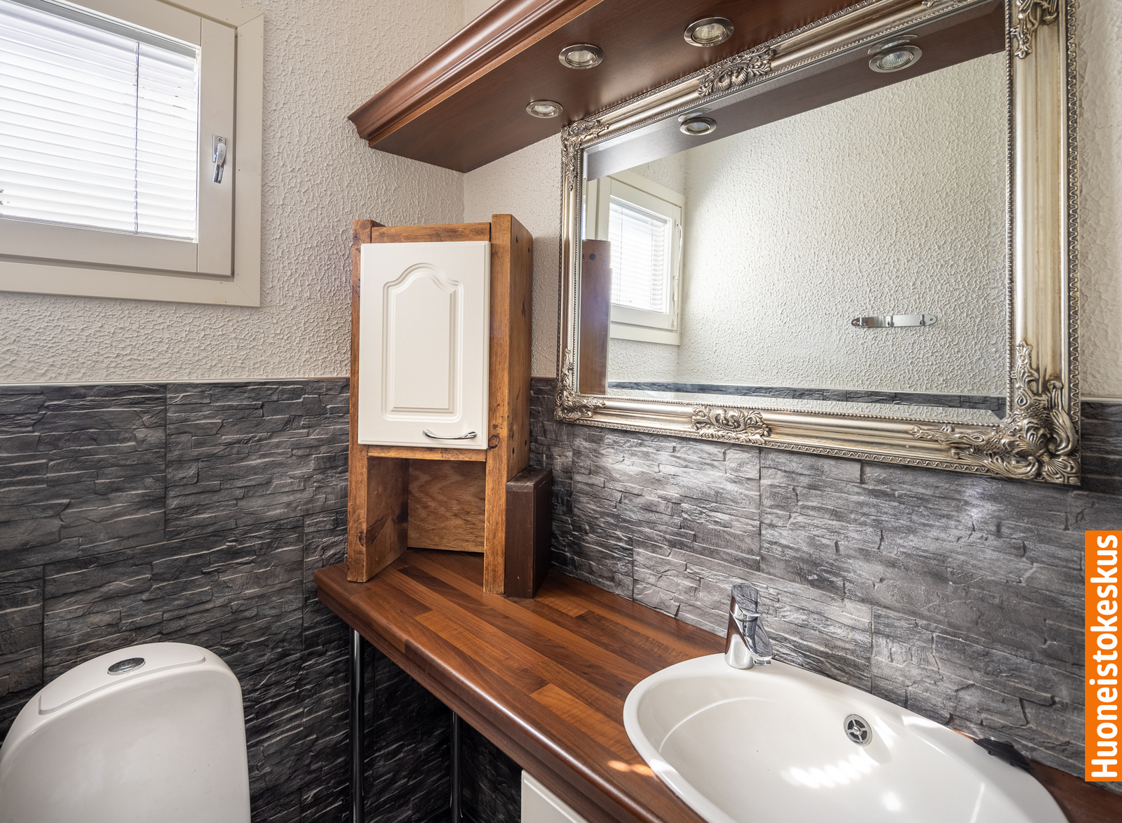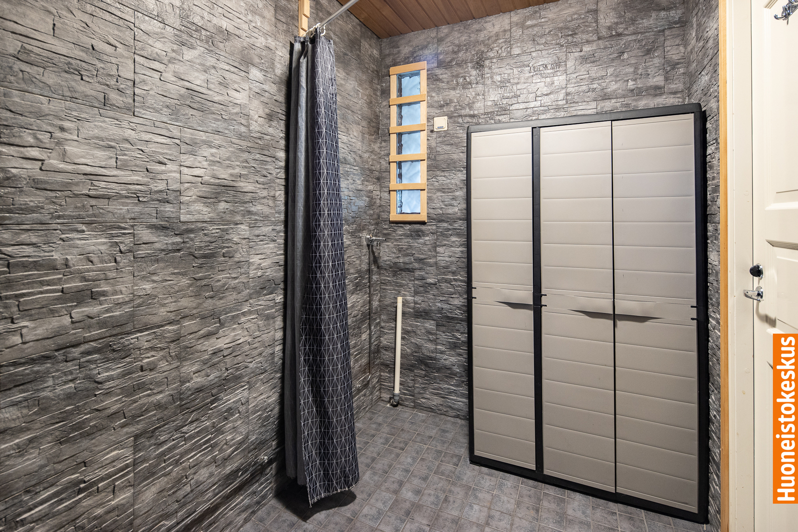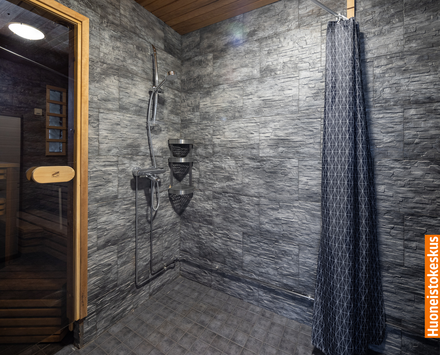 | Kylpyhuoneen kuvaus | Lattialämmitys, pesukoneliitäntä, suihku ja kiinteät valaisimet, seinät (kaakeli), lattiat (laatta) |