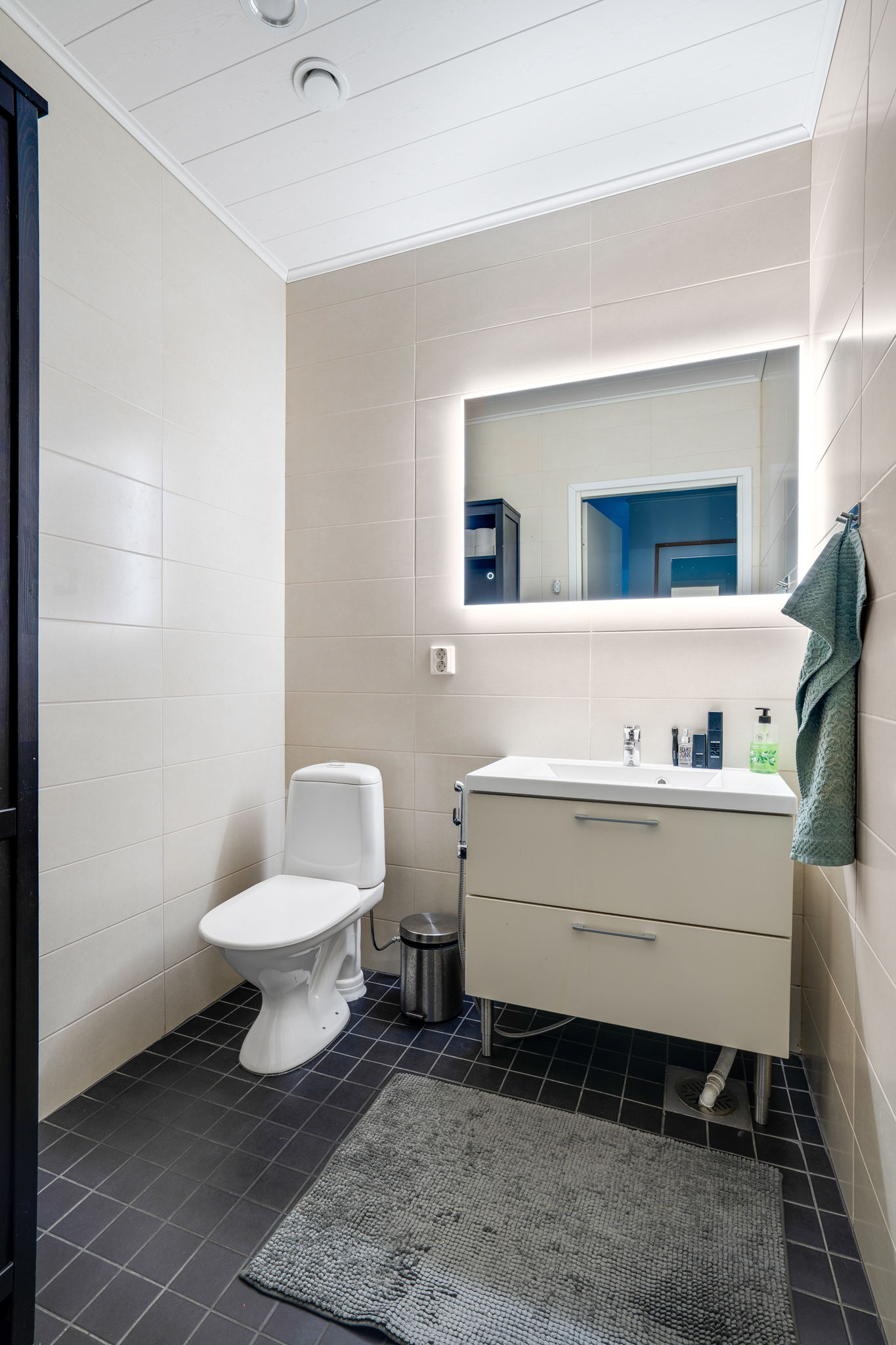 | Kylpyhuoneen kuvaus | Suihku (Sadesuihkulla), wc-istuin ja lattialämmitys, seinät (kaakeli), lattiat (laatta) |
