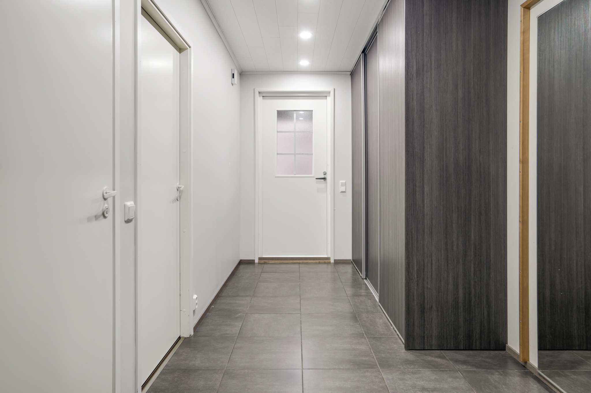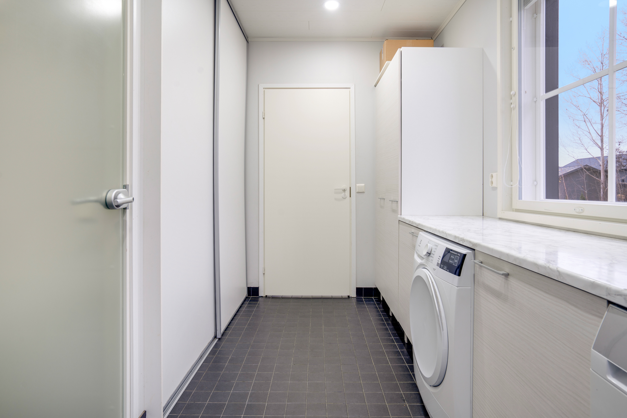 | Kodinhoitohuoneen kuvaus | Tila pesutornille (Vierekkäin paikat), lattialämmitys, pesukoneliitäntä, pesuallas, lattiakaivo, pyykkikaapit ja siivouskaappi, tekninen tila kodinhoitohuoneen yhteydessä, lattiat (laatta), seinät (maali) |