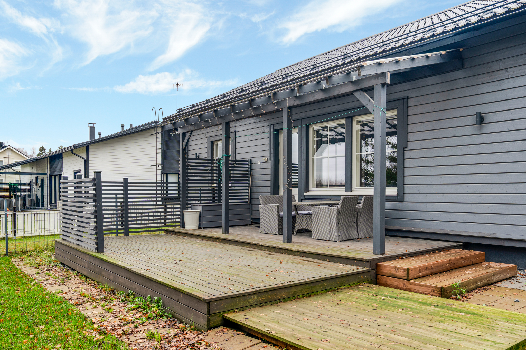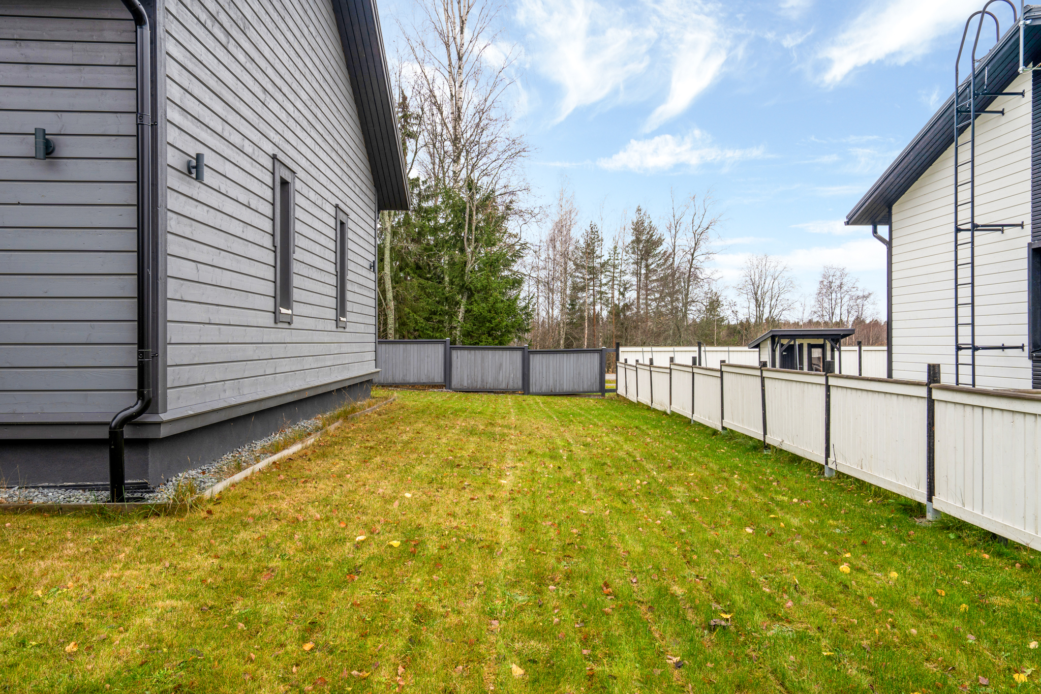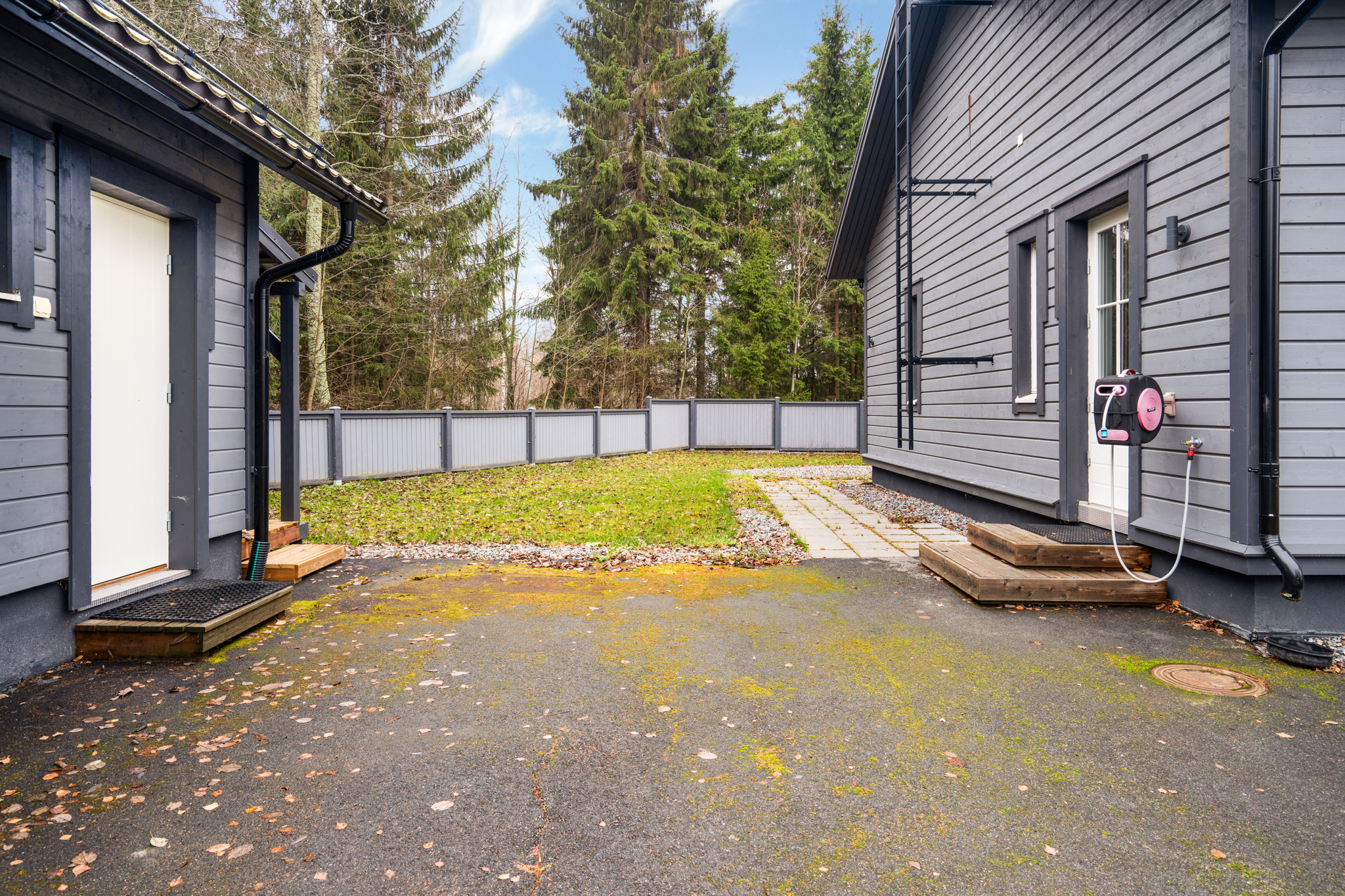 Piha-alue on nurmetettu ja muutenkin helppohoitoinen. Ajoväylät asfaltoitu. Terassin pinta-alaa on n. 30 m². Kiinteistö on liitetty valokuituun. Autotalliin voi halutessaan rakentaa väliseinän, jolloin siihen saa erikseen varaston.