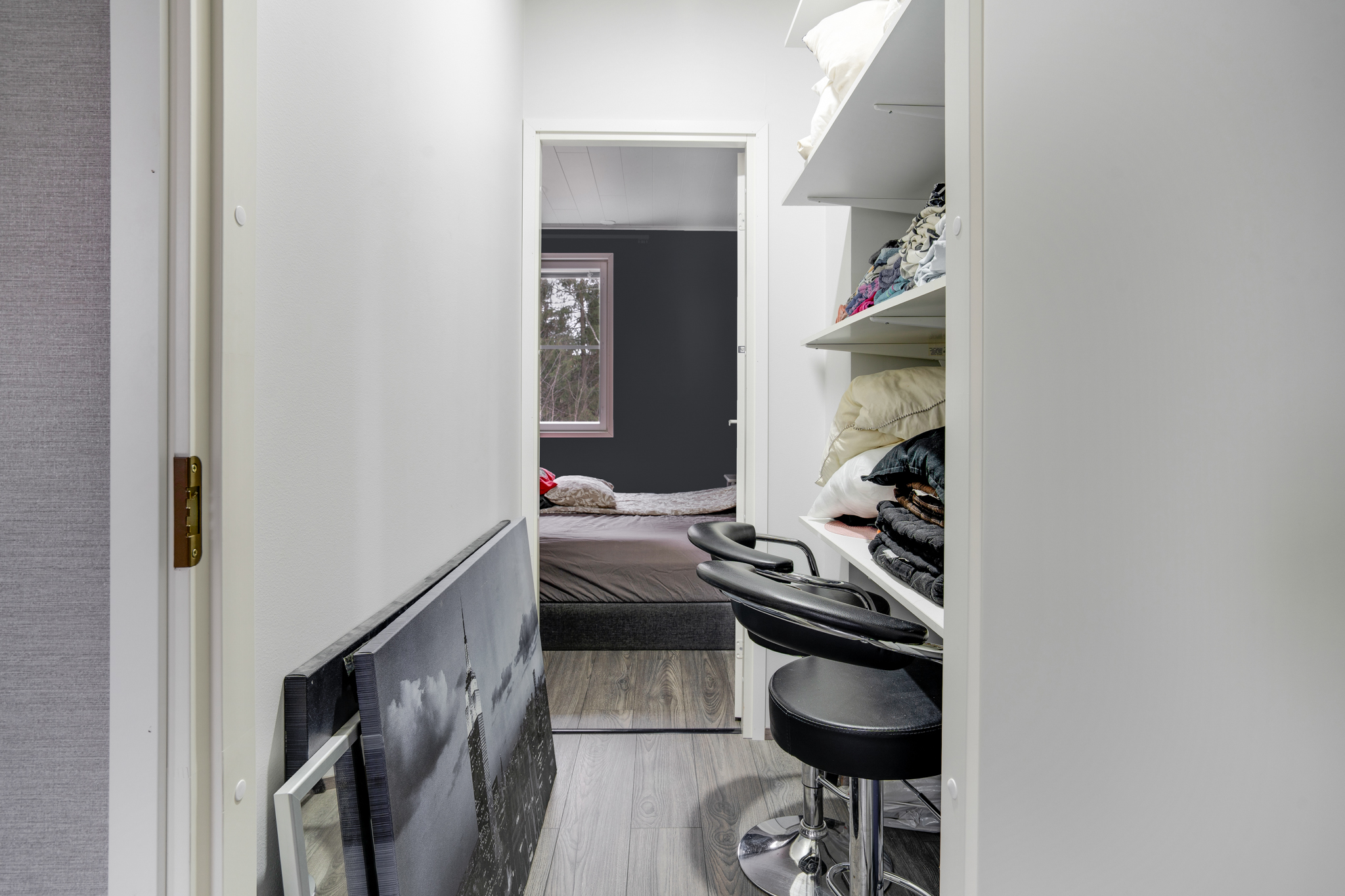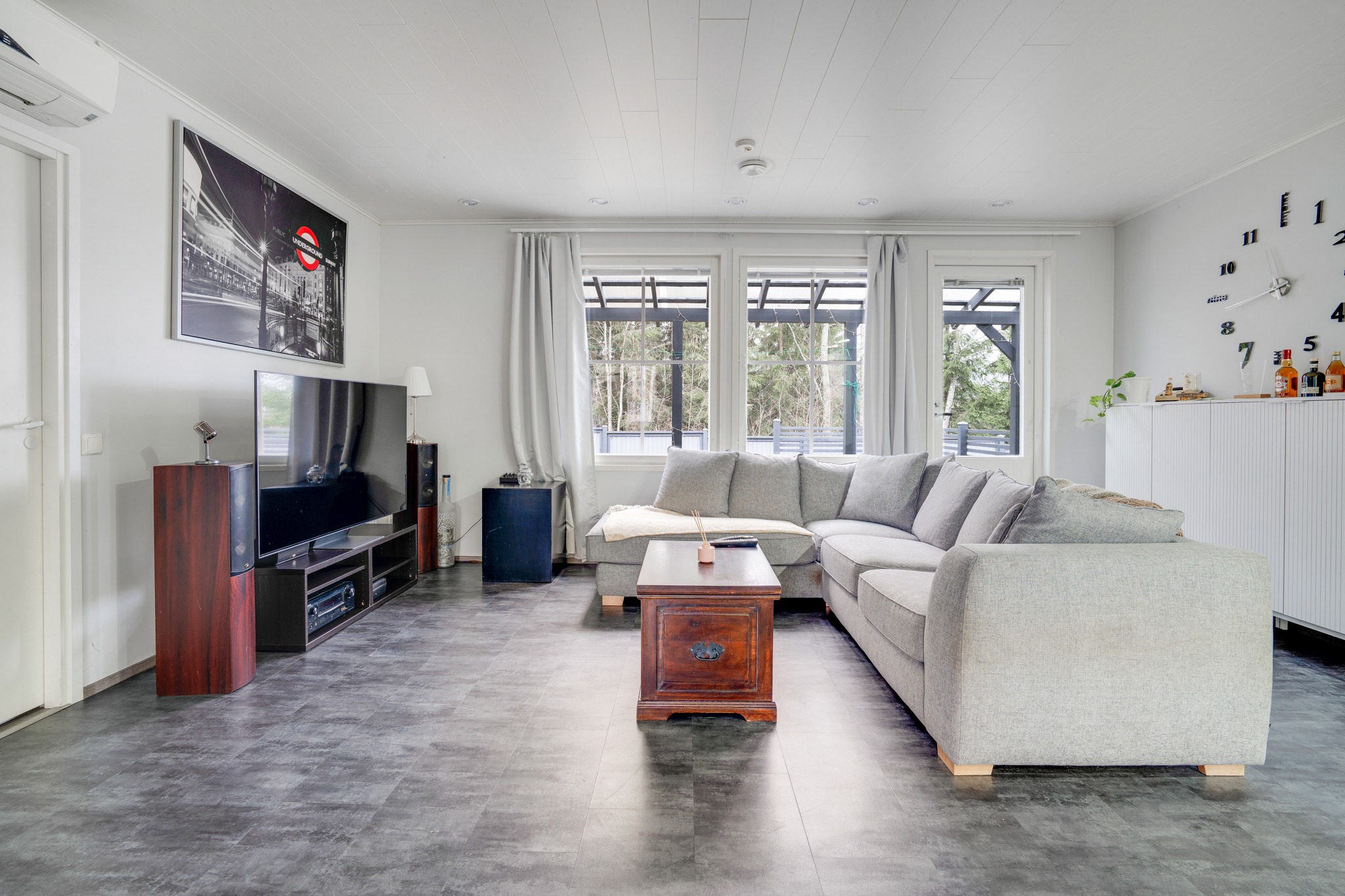 Asuinrakennuksessa lämmönjako tapahtuu vesikiertoisella lattialämmityksellä. Lisäksi viilennykseen on maalämmössä viilennystoiminto, joka toimii samalla periaatteella kuin ilmalämpöpumppu. Keskellä huoneistoa on takka, joka on itseasiassa käyttämätön. Kodinhoitohuoneessa on pesualtaan lisäksi myös kattavasti kaappitilaa ja sieltä löytyy liukuovien takaa myös ns. tekninen tila. Kylpyhuone tarjoaa sadesuihkun ja reilunkokoisesta sekä tunnelmallisesta saunasta löytyy Harvian 9kW:n suosittu pilarikiuas. Yleisissä tiloissa lattiamateriaalina kulutusta hyvin kestävää vinyylikorkki ja laattaa, makuuhuoneissa laminaattilattiat. Seinäpinnat pääasiassa maalipinnoin. Erillinen WC tarjoaa taustavalaistun valopeilin (uusittu v. 2024) ansiosta hyvät puitteet laittautua.