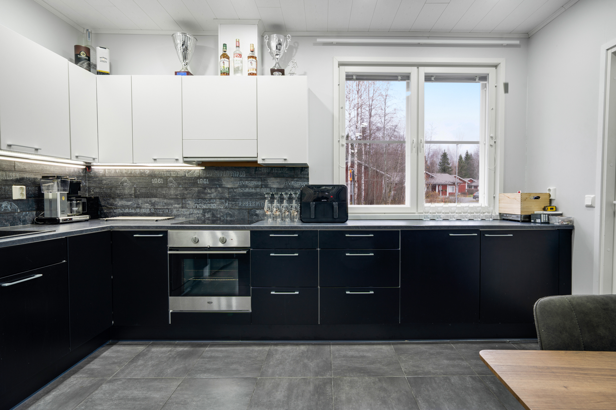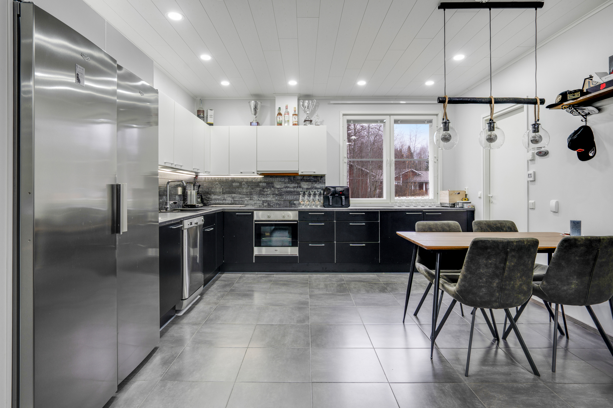 | Keittiön kuvaus | Liesi (Keraaminen liesi), työtasot (laminaatti), seinät (maali ja laminaatti välitilassa), lattiat (laatta), jääkaappi, erillinen pakastin, erillisuuni, liesi, astianpesukone ja liesituuletin |