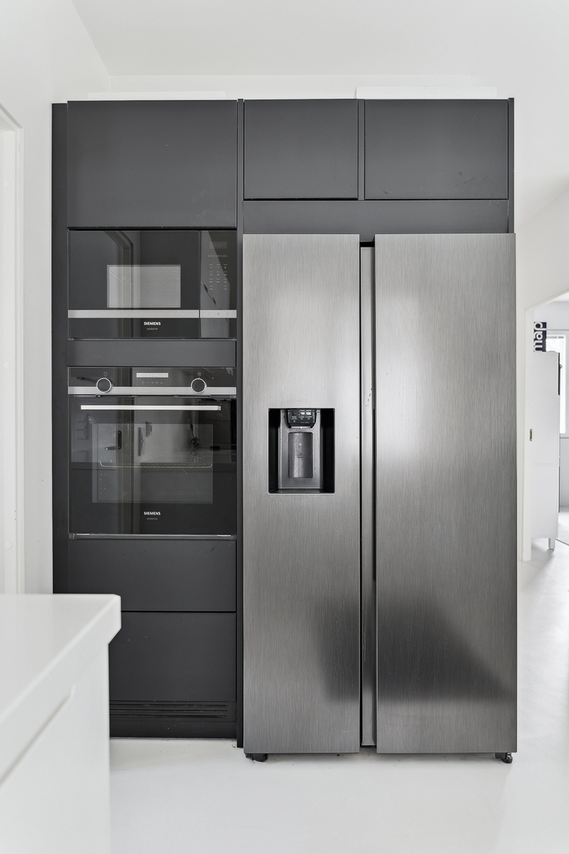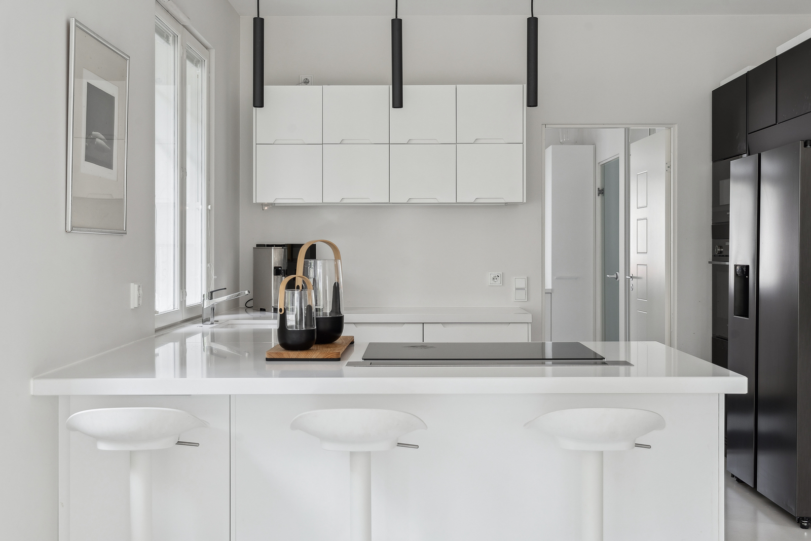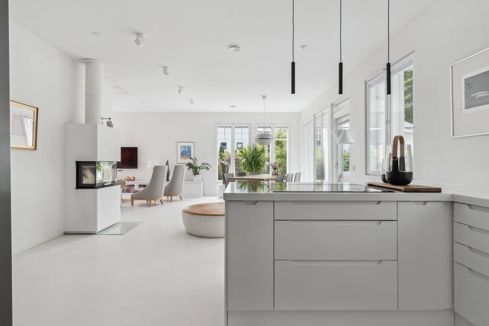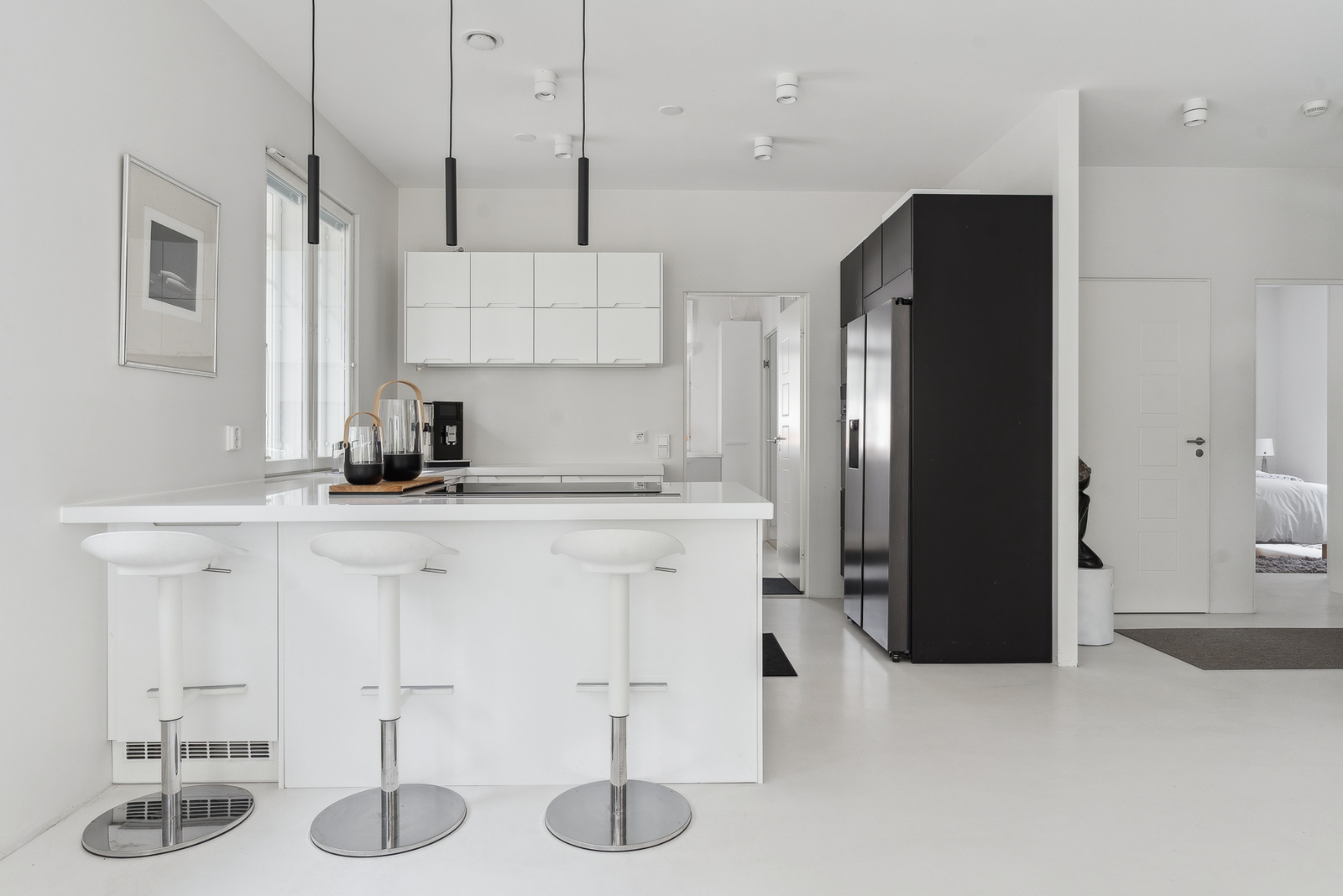 Liesi (Induktioliesi ja erillisuuni), työtasot (kvartsikomposiitti), seinät (maali), lattiat (betoni), erillisuuni, erillinen pakastin, liesituuletin, liesi, jääkaappi ja astianpesukone |