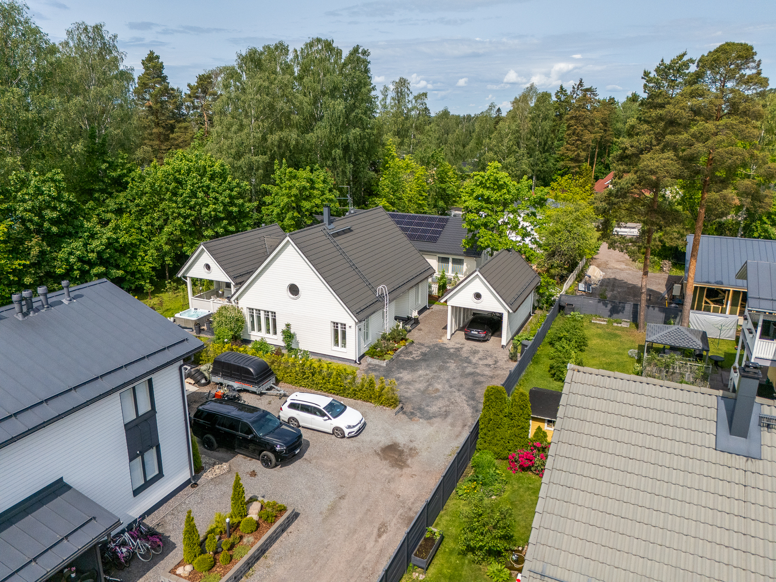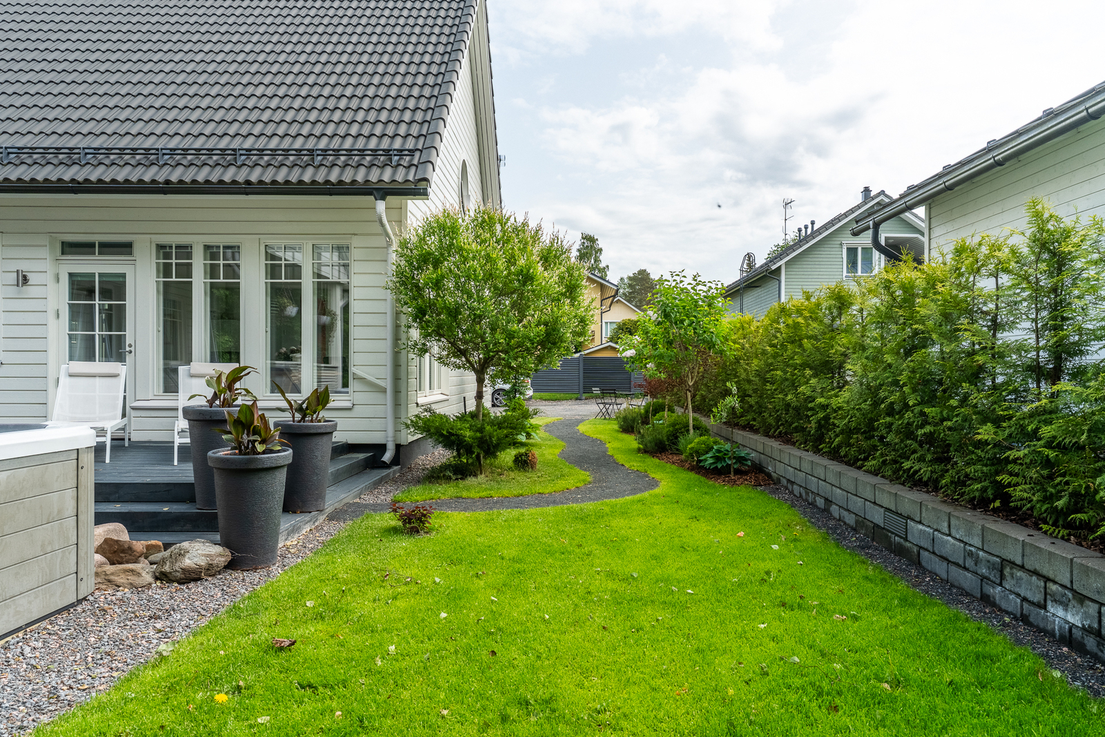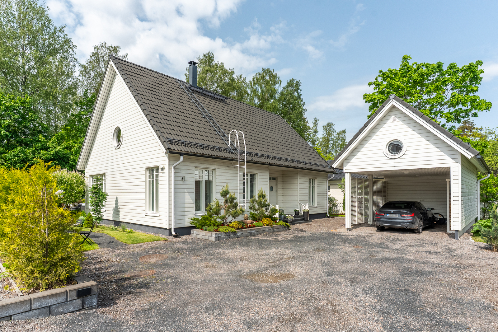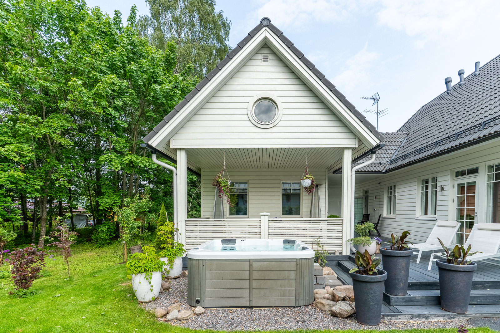 Pihapiiristä löytyy myös erillinen saunarakennus sekä autokatos/varastorakennus. Ulkona on tilava terassi, joka kutsuu viettämään aikaa perheen ja ystävien kanssa. Sijainti on erinomainen, sillä läheltä löytyvät niin koulut, puistot kuin hyvät julkiset liikenneyhteydetkin – bussipysäkki, juna-asema ja lentokenttä ovat kaikki helposti saavutettavissa.
