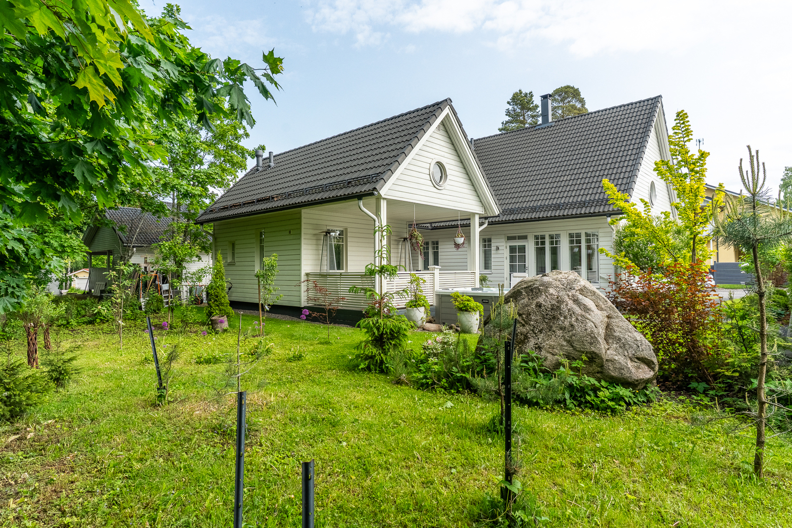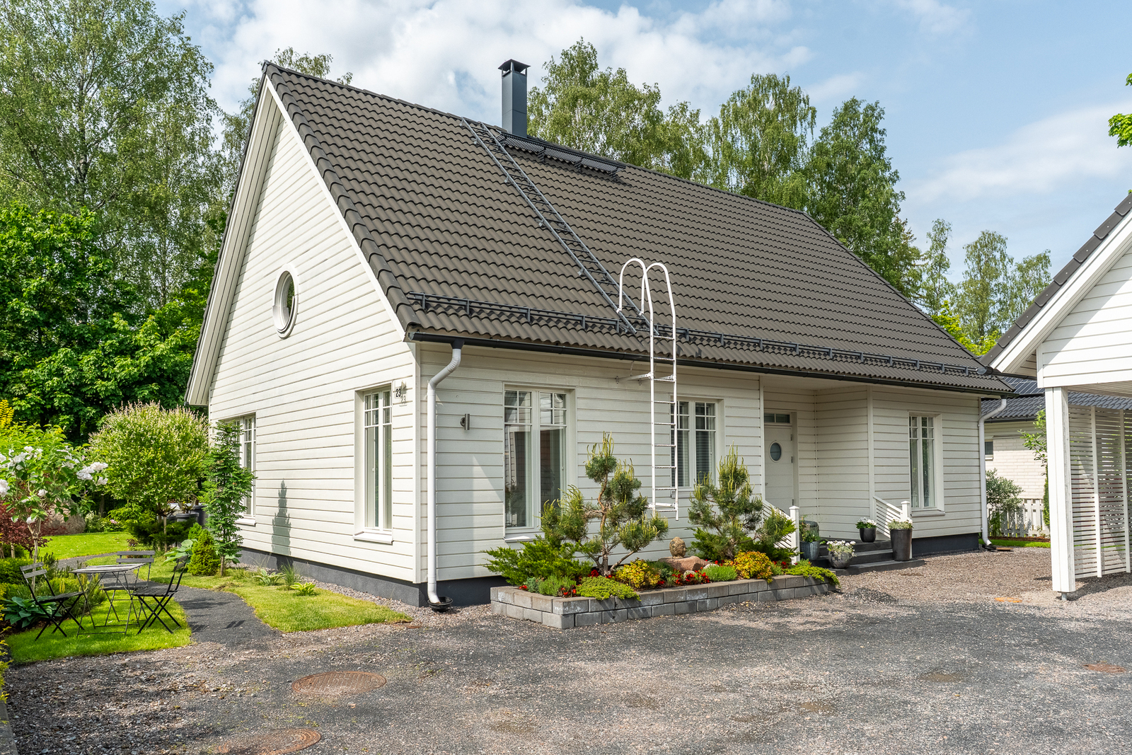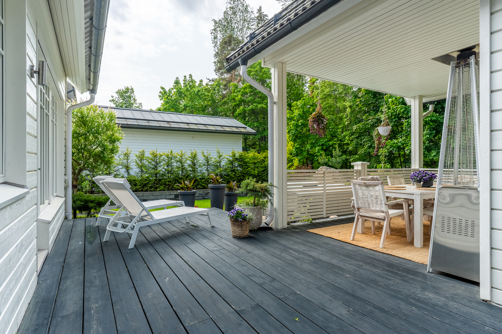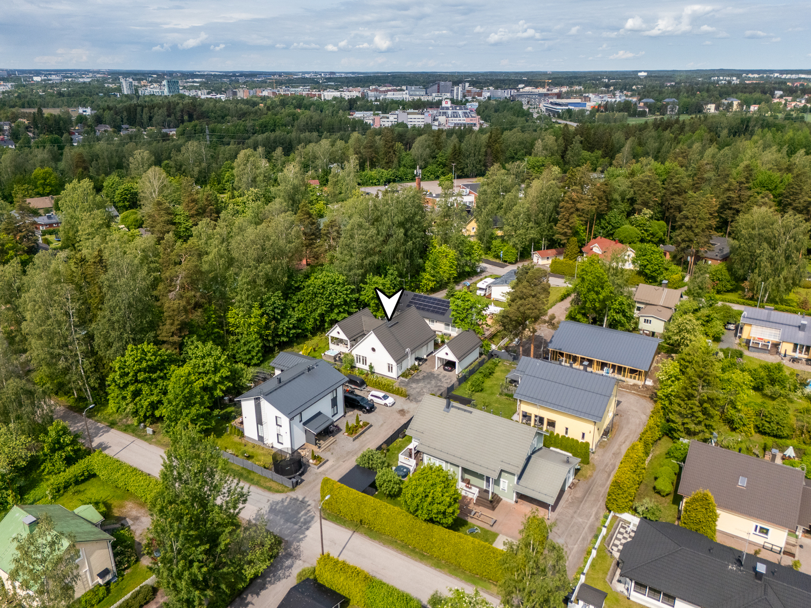 Pihapiiristä löytyy myös erillinen saunarakennus sekä autokatos/varastorakennus. Ulkona on tilava terassi, joka kutsuu viettämään aikaa perheen ja ystävien kanssa. Sijainti on erinomainen, sillä läheltä löytyvät niin koulut, puistot kuin hyvät julkiset liikenneyhteydetkin – bussipysäkki, juna-asema ja lentokenttä ovat kaikki helposti saavutettavissa.