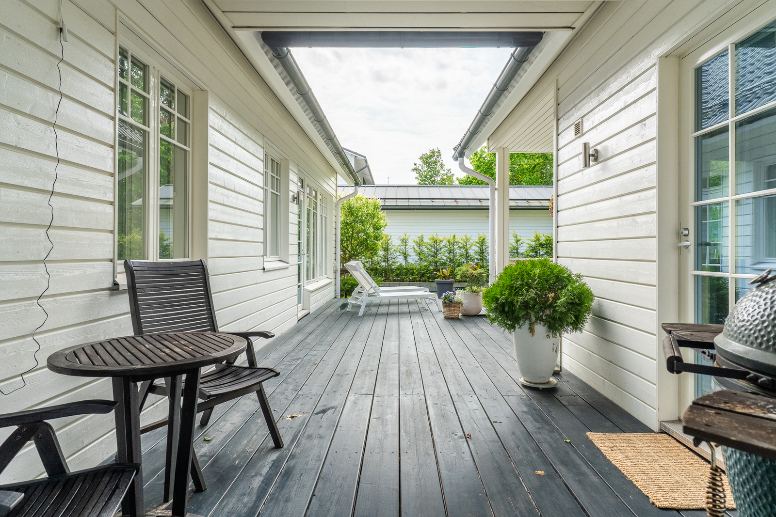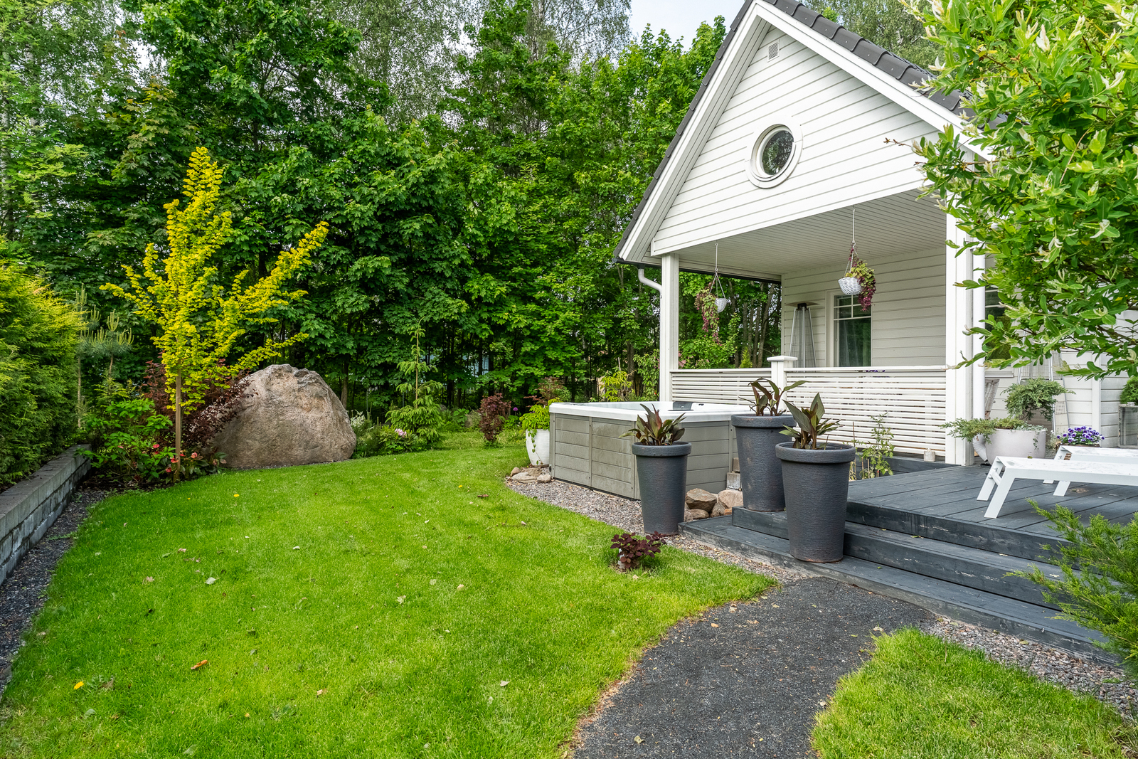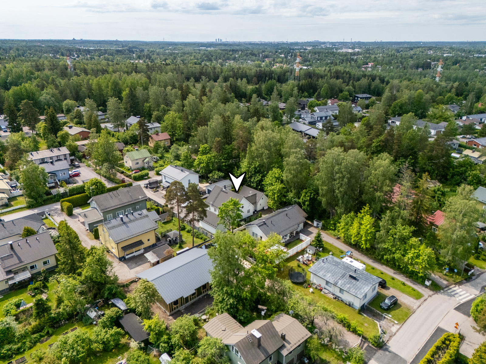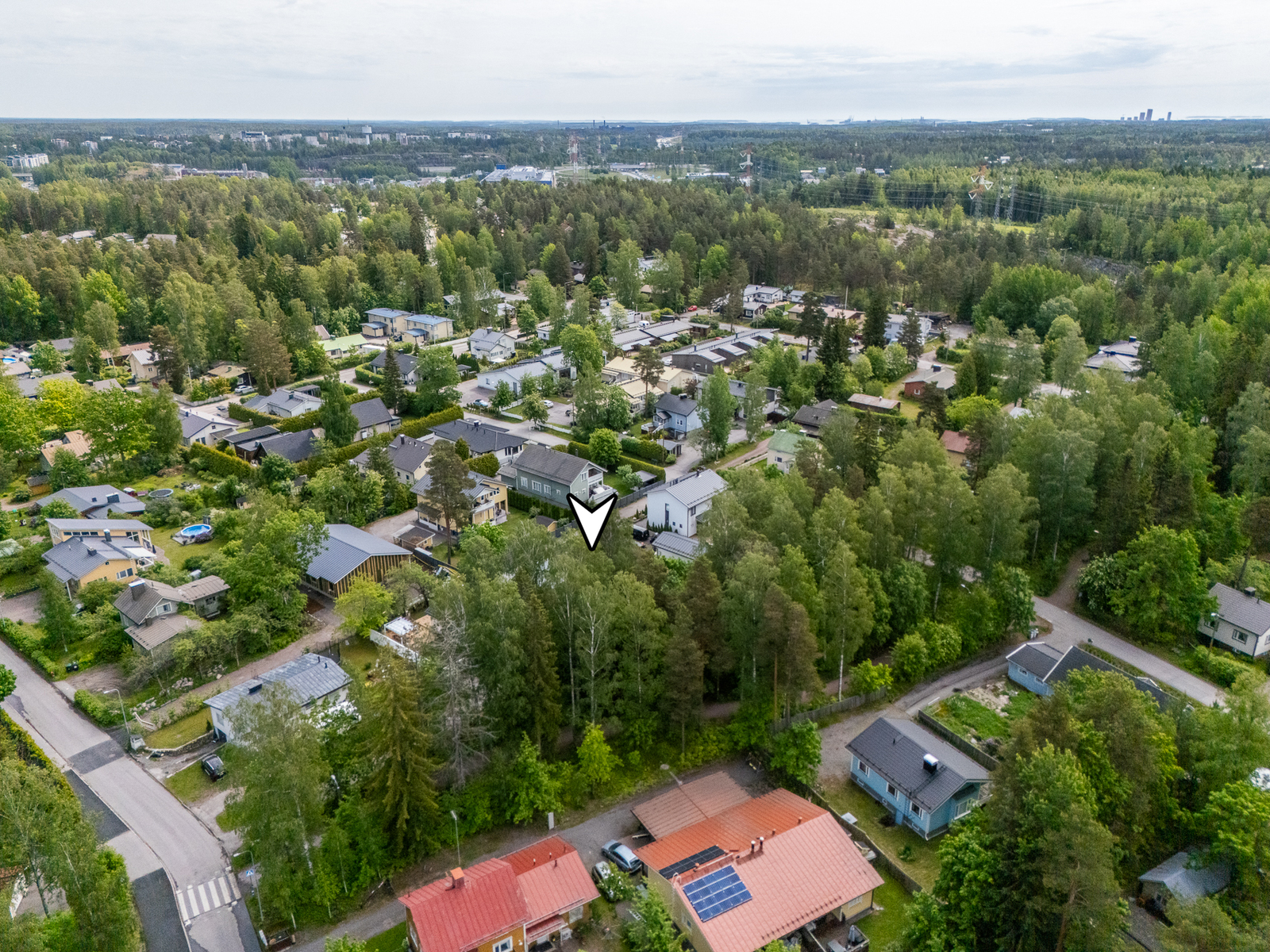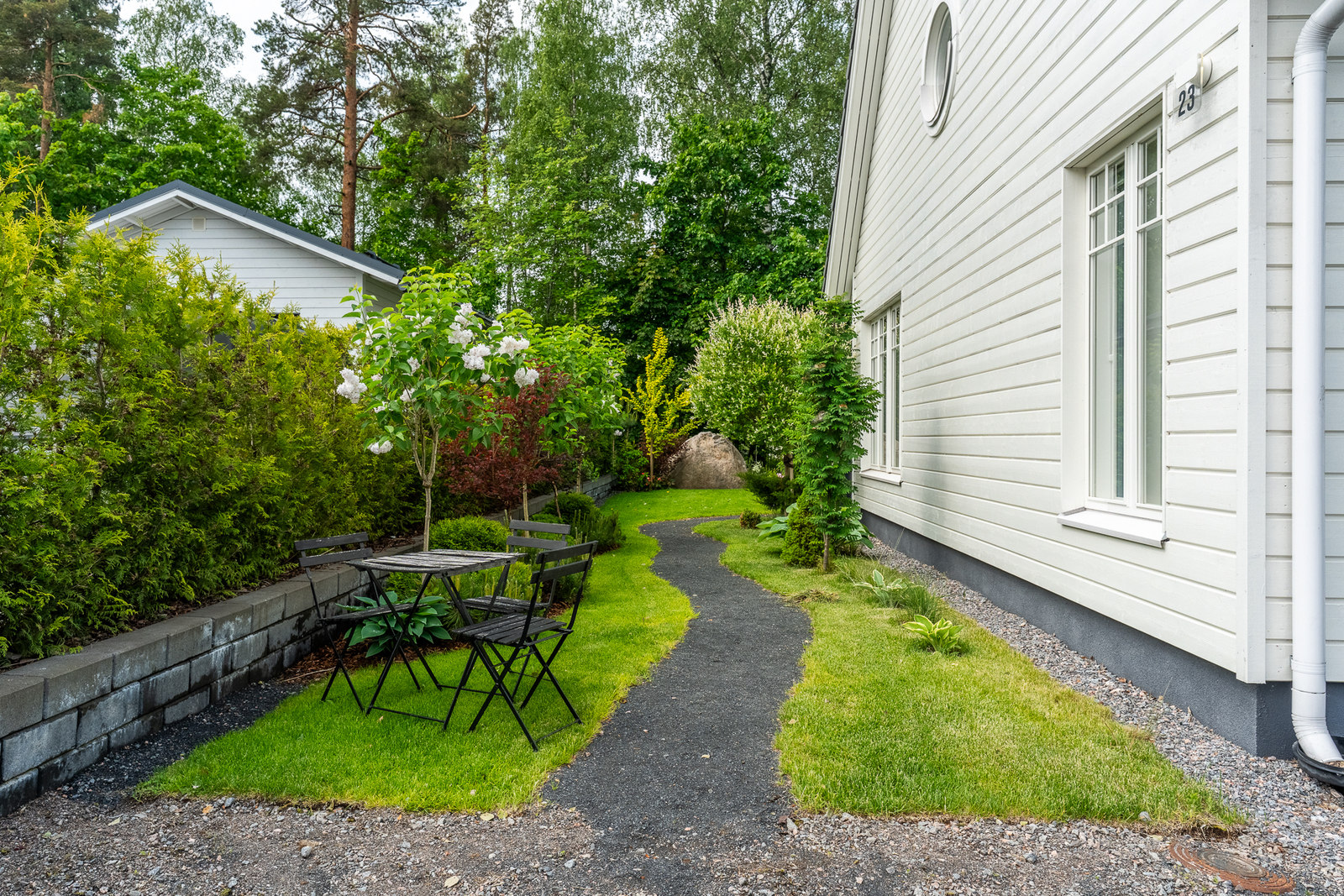 Pihapiiristä löytyy myös erillinen saunarakennus sekä autokatos/varastorakennus. Ulkona on tilava terassi, joka kutsuu viettämään aikaa perheen ja ystävien kanssa. Sijainti on erinomainen, sillä läheltä löytyvät niin koulut, puistot kuin hyvät julkiset liikenneyhteydetkin – bussipysäkki, juna-asema ja lentokenttä ovat kaikki helposti saavutettavissa.