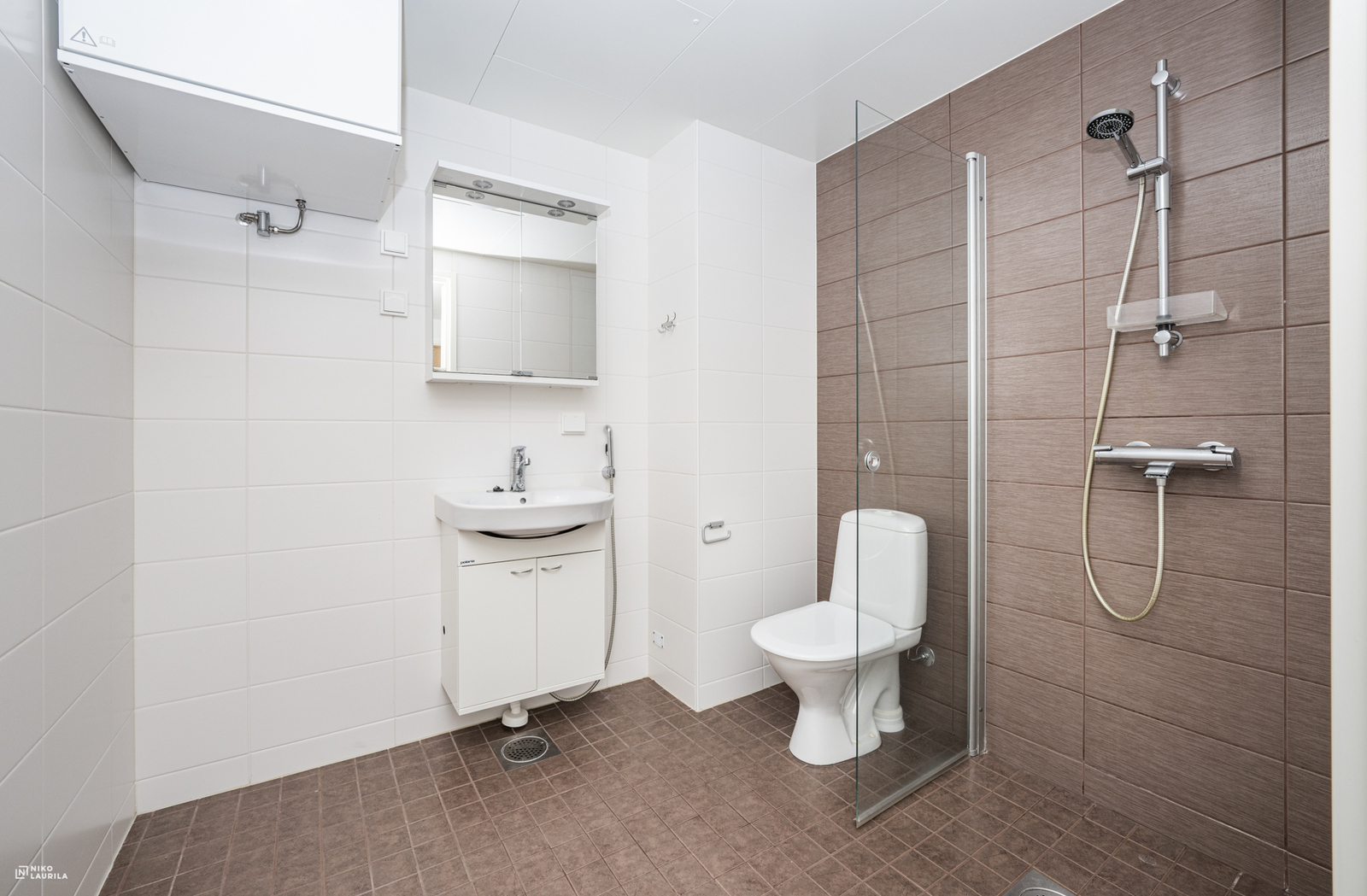 Lattialämmitys, peilikaappi, suihkuseinä, suihku, wc-istuin, pesukoneliitäntä ja kiinteät valaisimet |