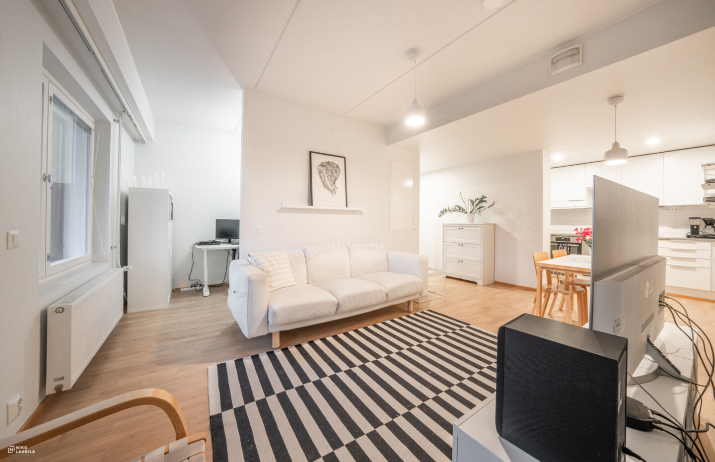 | Lisätietoja pinta-alasta | Virallinen huonejärjestelmähän on 2h+k+s, mutta työtila/lasten leikkitila tms. olohuoneen jatkeena/takana on loistava lisätila, eli käytännössä kyseessä pieni kolmio! |