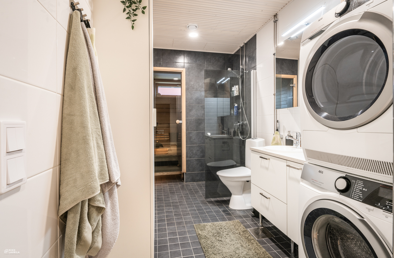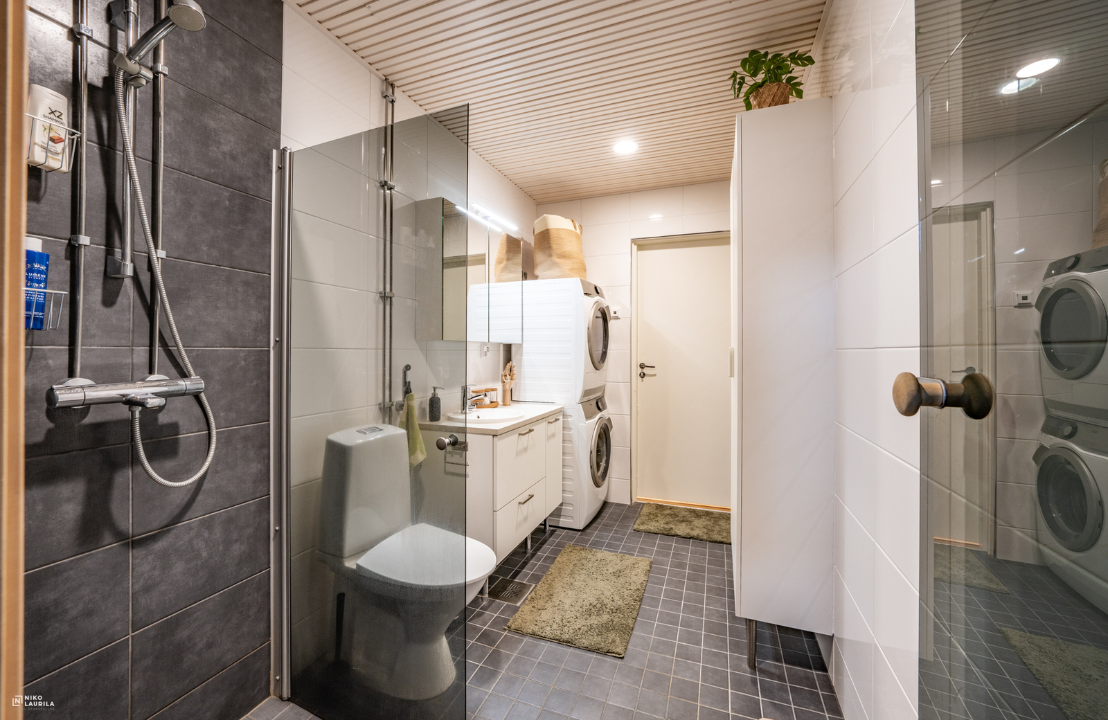 Allaskaappi, lattialämmitys, pesukoneliitäntä, suihku, suihkuseinä, peili, wc-istuin ja kiinteät valaisimet, seinät (kaakeli), lattiat (laatta) |