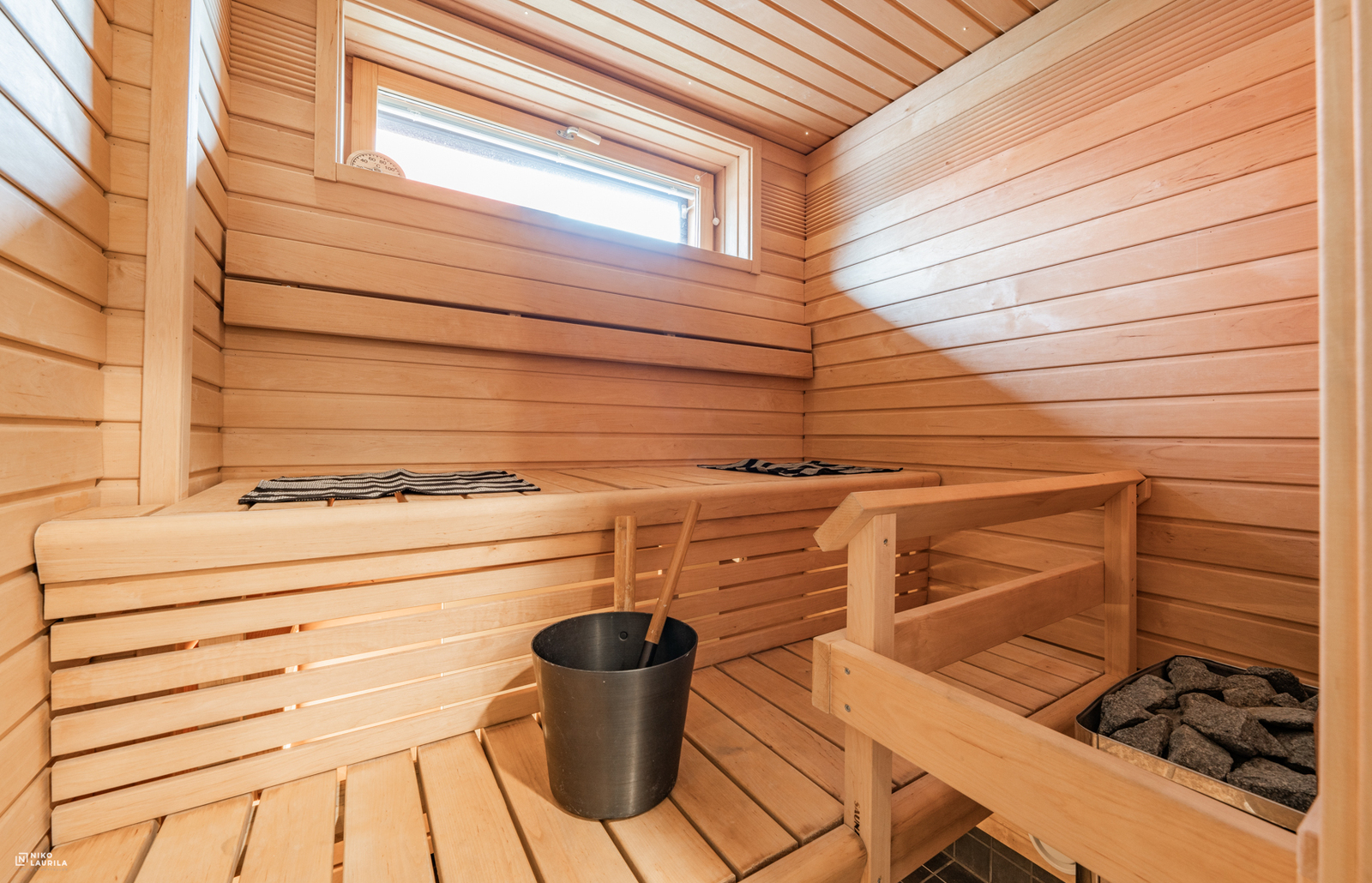 Seinät (puu), lattiat (laatta), Sähkökiuas, Harvian kiuas, ikkuna ulos. |