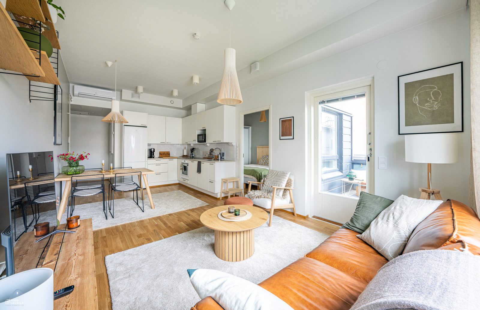 Seinät (maali), lattiat (parketti), Olohuoneessa ilmalämpöpumppu viilennykseen ja käynti lasitetulle parvekkeelle. |